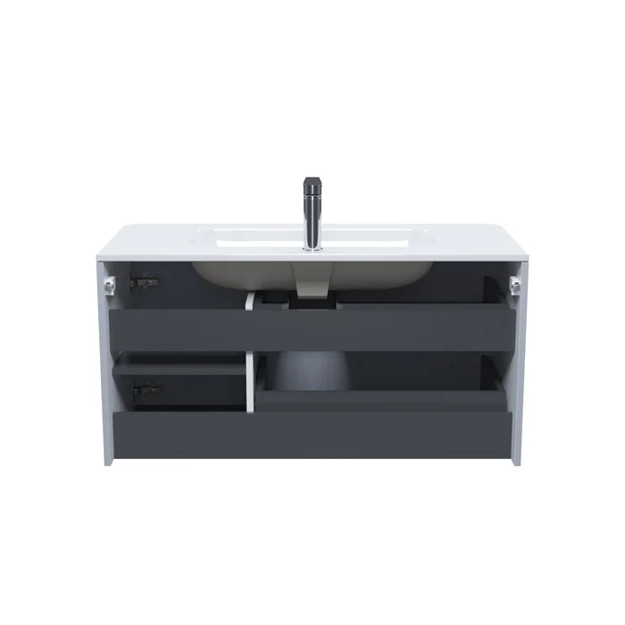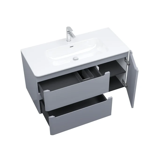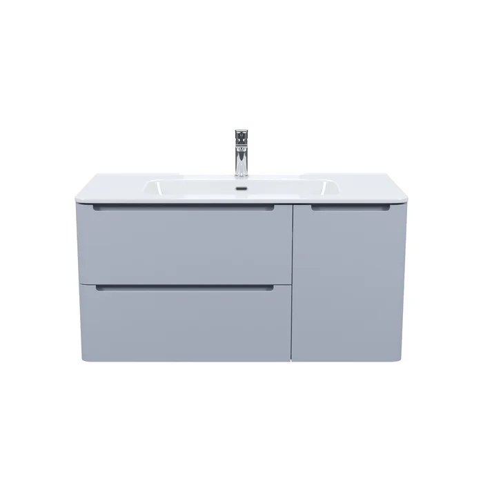Вместительная подвесная тумба с плоским умывальником Edifice в стильном светло-сером цвете – воплощение современного минимализма. Мягкие линии корпуса в сочетании с удобными интегрированными ручками выглядят свежо и актуально. Смотрится аккуратно, легко и не усложняет процесс уборки в ванной благодаря подвесной конструкции.