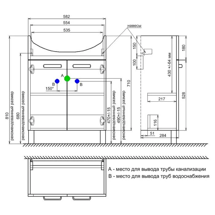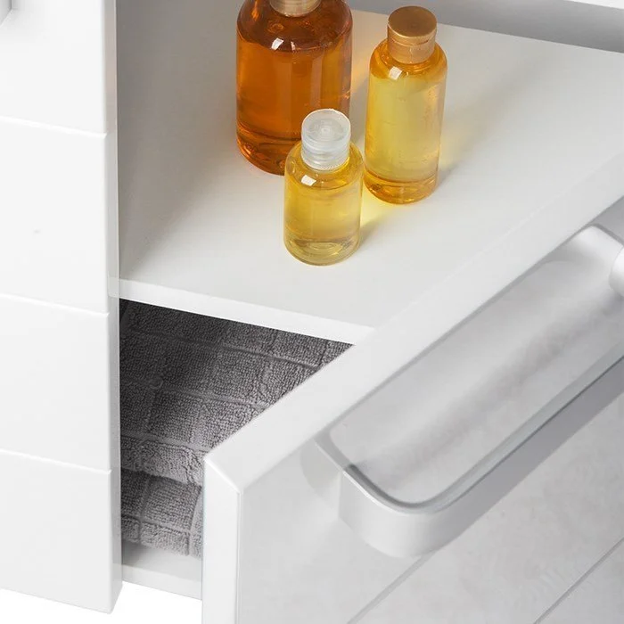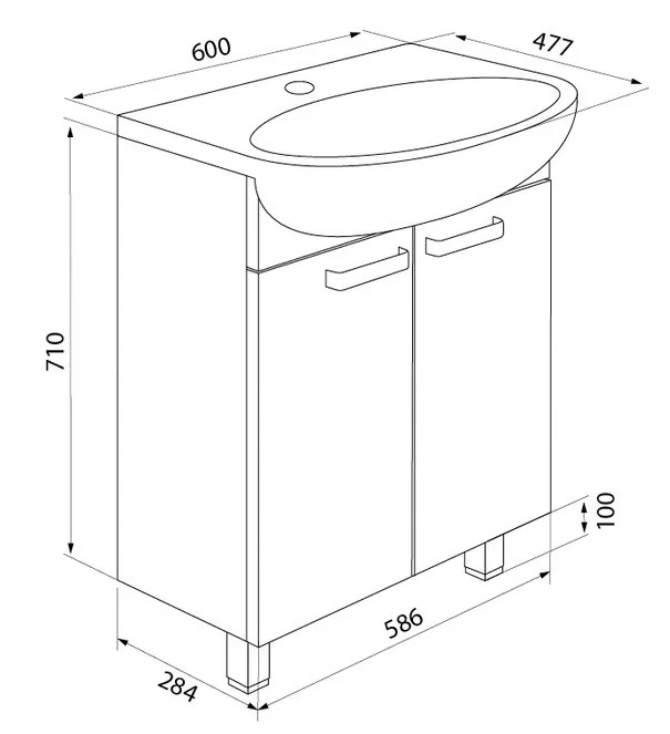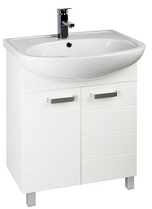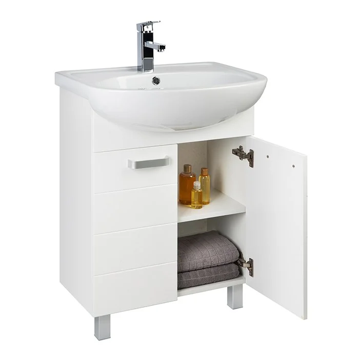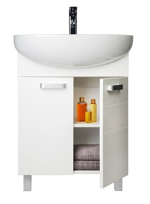 Тумба с умывальником для ванной комнаты, напольная. Размеры тумбы без умывальника: 284х586х710 мм (ДхШхВ). Размеры умывальника: 477х600 мм (ДхШ). Фасад МДФ 16мм в эмали, боковины ЛДСП белый глянец. Две дверцы. Петли с доводчиком