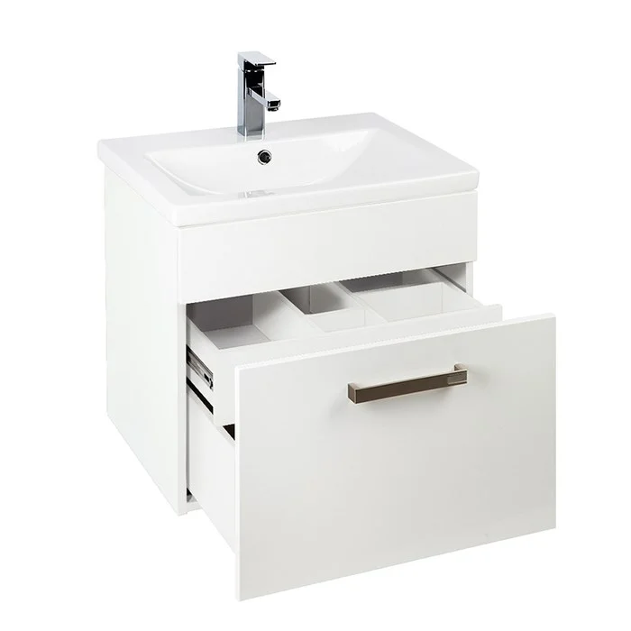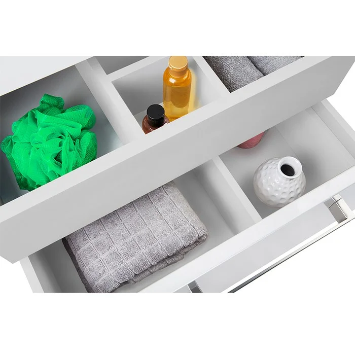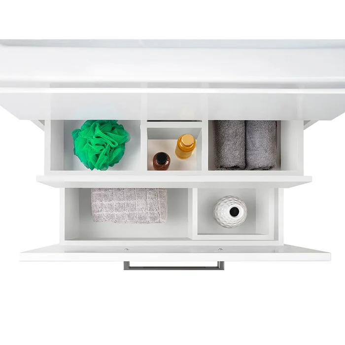 Фасад ЛДСП 16мм, эмаль, цвет белый глянец. Боковины ЛДСП 16 мм, эмаль, цвет белый. Выдвижной ящик с механизмом плавного доведения, внутренний ящик для мелочей без доводчика, перекатной организатор.