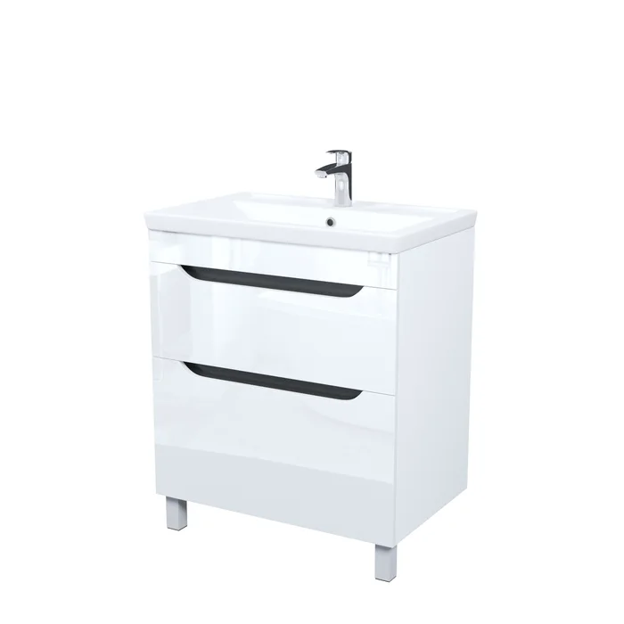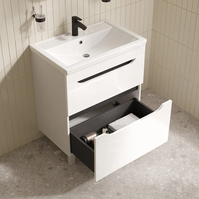 Напольная тумба для ванной Ray с Раковинаом и выдвижными ящиками – универсальная и практичная мебель, которая будет отлично смотреться в любом современном интерьере. Сочетание белого цвета, светло-серых элементов фасада и темно-серых ящиков создает стильный дизайн вне времени. У тумбы увеличенная высота, что делает ее более вместительной и удобной.