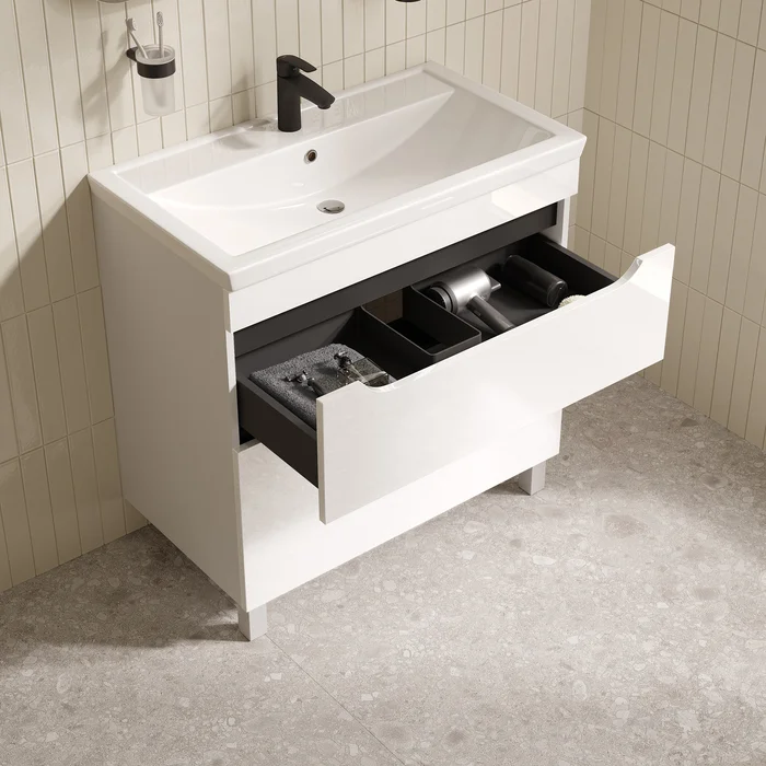 Напольная тумба для ванной Ray с Раковинаом и выдвижными ящиками – универсальная и практичная мебель, которая будет отлично смотреться в любом современном интерьере. Сочетание белого цвета, светло-серых элементов фасада и темно-серых ящиков создает стильный дизайн вне времени. У тумбы увеличенная высота, что делает ее более вместительной и удобной.