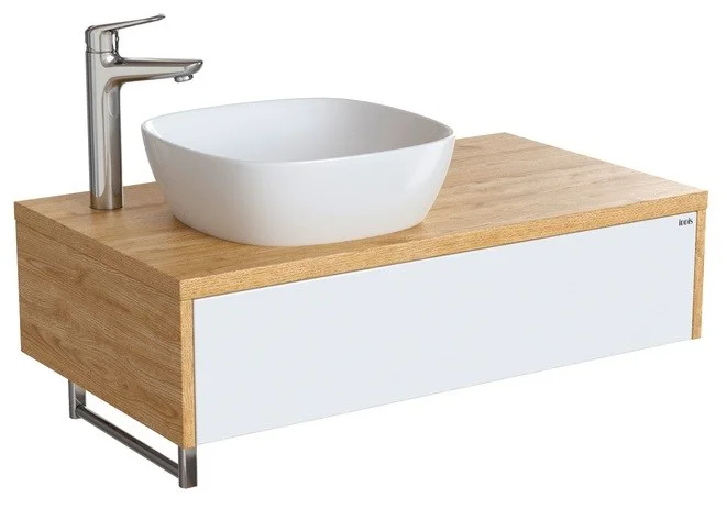 Столешница шпонированный МДФ 23 мм, матоваый лак. Боковины шпонированный МДФ 17 мм, матовый лак. Один выдвижной ящик с фасадом ЛДСП 16мм, эмаль белый глянец. Направляюшие с доводчиком "Push to Open". Полотенцедержатель хром, высота 7 см. Пластиковый ограничитель под сифон в ящике.