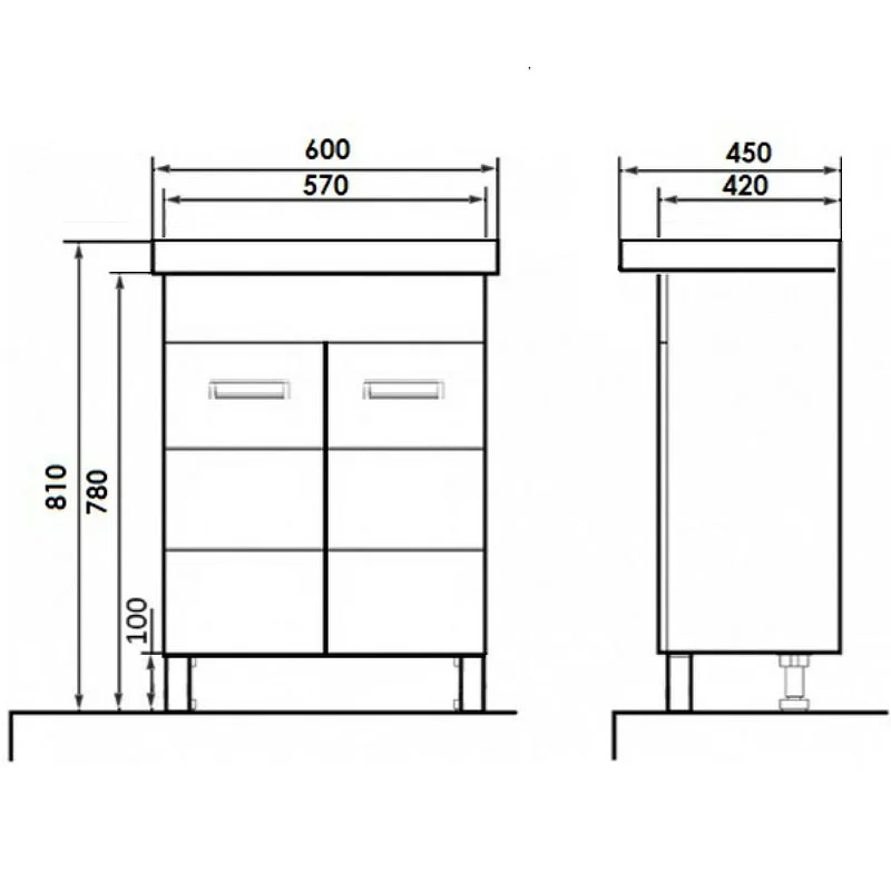 Габариты с учетом раковины и ножек (ШхВхГл): 60х81х45 см