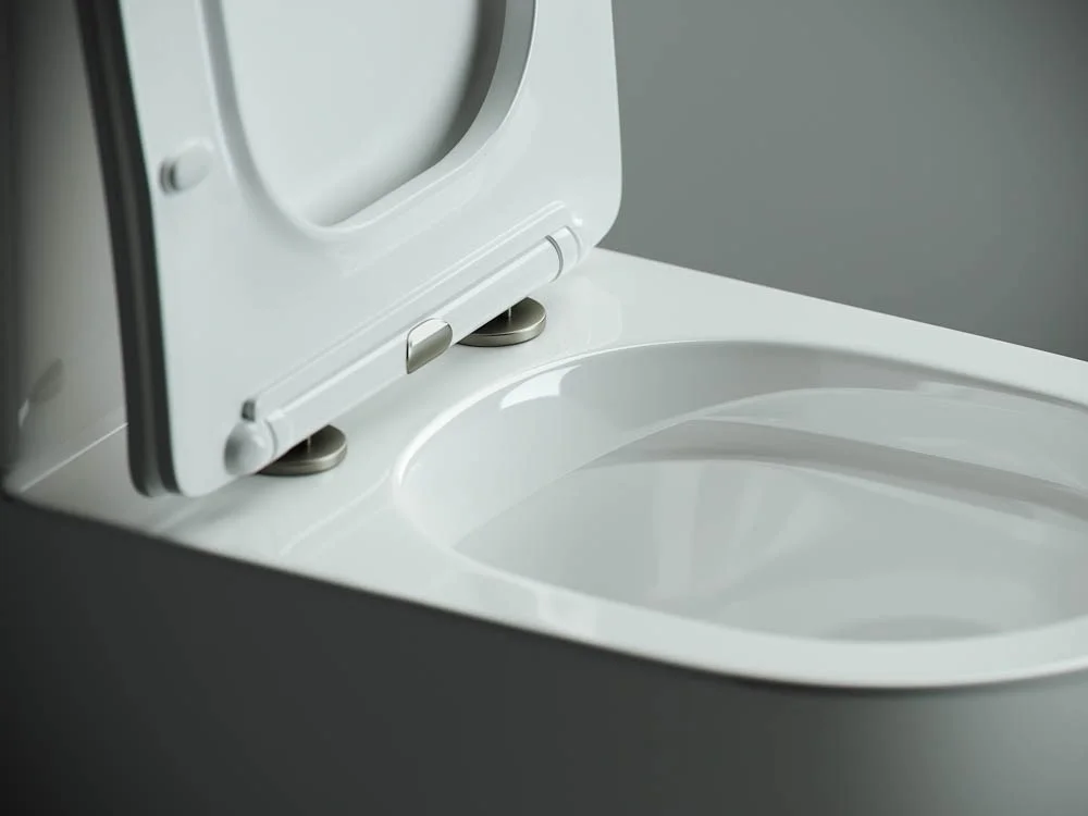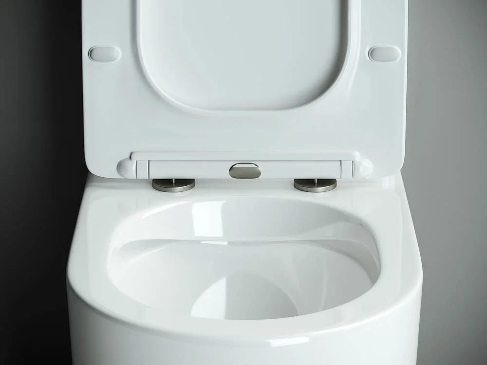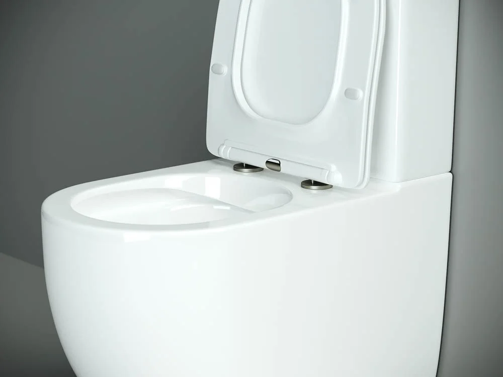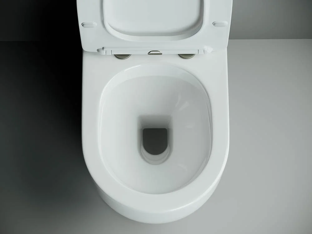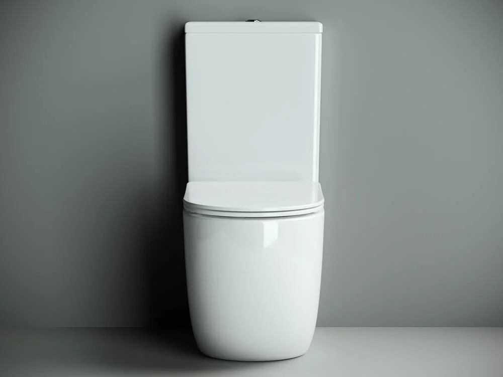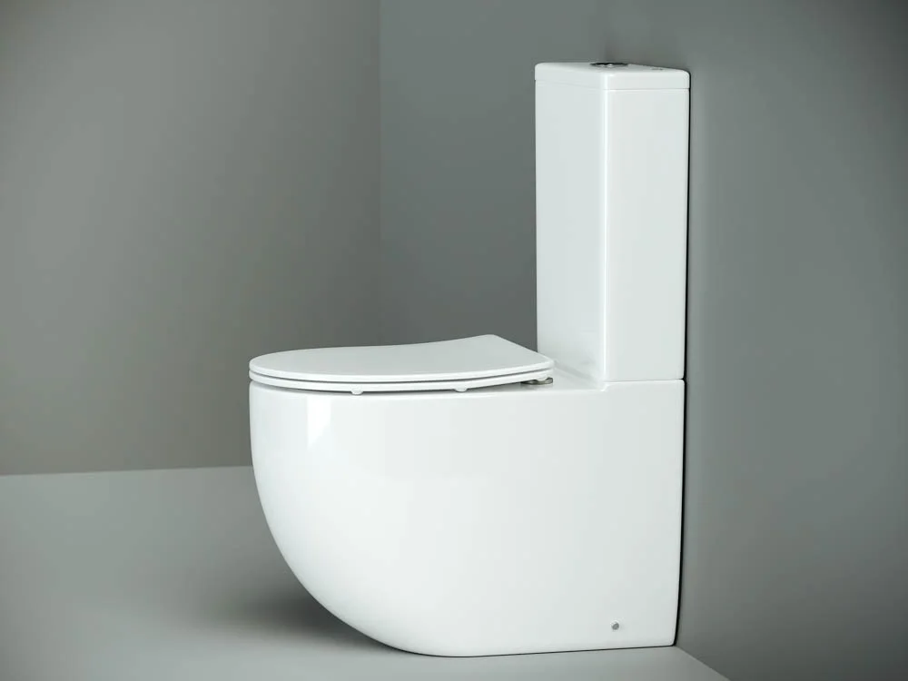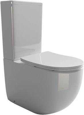Напольный пристенный унитаз с бачком Mia Rimless, двойной смыв 3/6 арматура Geberit, нижняя подводка глубокий смыв, горизонтальный (универсальный) выпуск, с крепежом, с ультра тонким сидением и крышкой с функцией плавного закрытия, дюропласт.