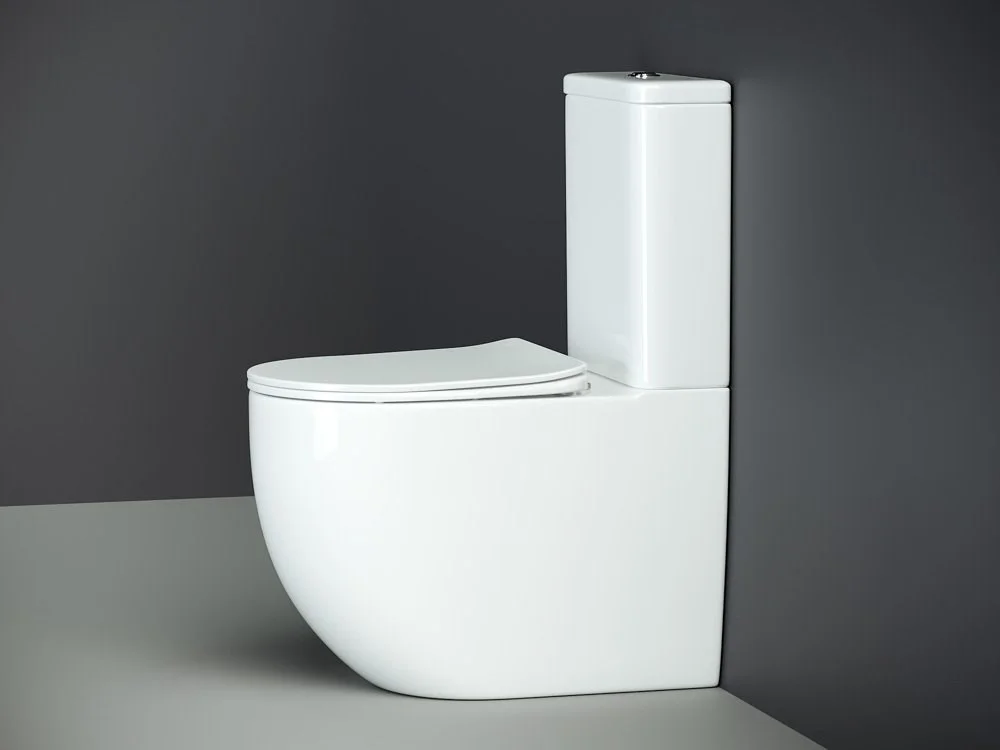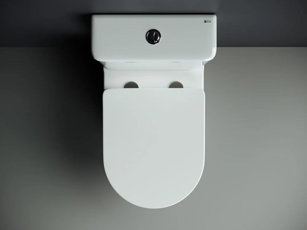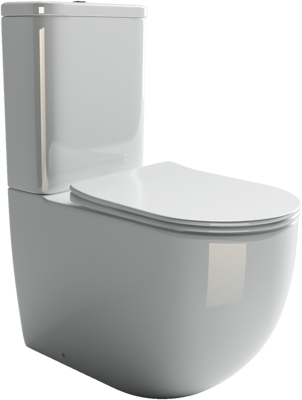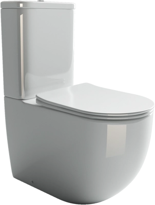Напольный пристенный унитаз с бачком Mia Rimless, двойной смыв 3/6 арматура Geberit, нижняя подводка глубокий смыв, горизонтальный (универсальный) выпуск, с крепежом, с ультра тонким сидением и крышкой с функцией плавного закрытия, дюропласт.
