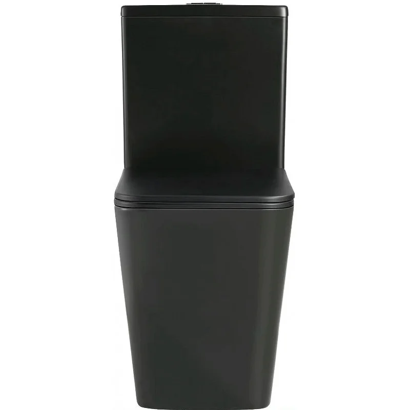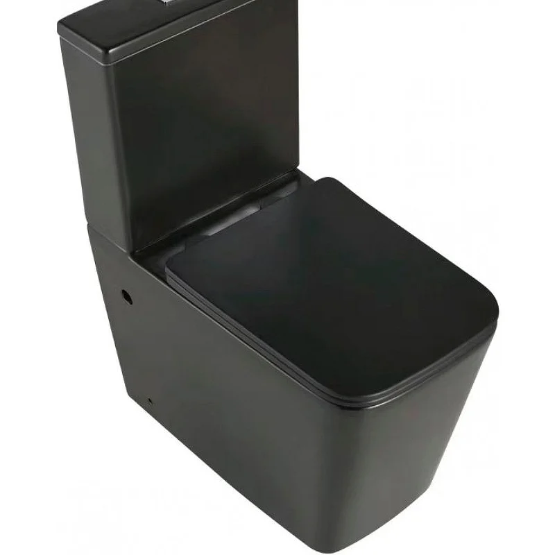 БЕЗОБОДКОВЫЙ напольный унитаз. Бортик по периметру чаши. Горизонтальный выпуск ("P-Trap"). Нижний подвод воды. Цвет: чёрный матовый. Арматура: "GEBERIT" с двойной кнопкой слива (4/6 л). Сиденье: тонкое, быстросъёмное, дюропласт с металлическим крепежом и микролифтом (механизм "Soft Close").