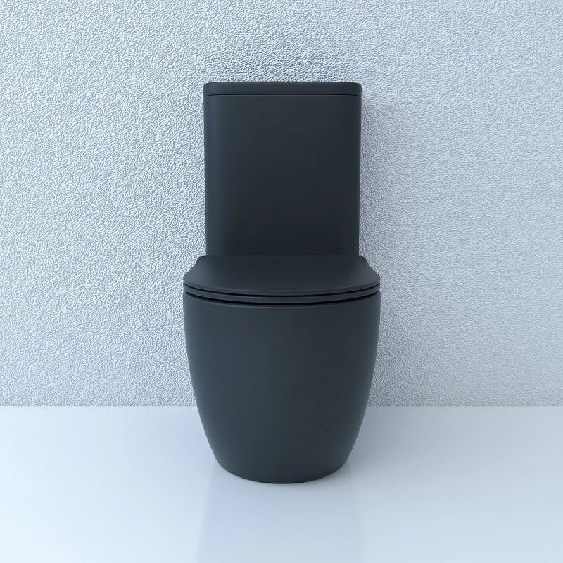 БЕЗОБОДКОВЫЙ напольный унитаз. Бортик по периметру чаши. Горизонтальный выпуск ("P-Trap"). Нижний подвод воды. Цвет: чёрный матовый. Арматура: "GEBERIT" с двойной кнопкой слива (4/6 л). Сиденье: тонкое, быстросъёмное, дюропласт с металлическим крепежом и микролифтом (механизм "Soft Close").
