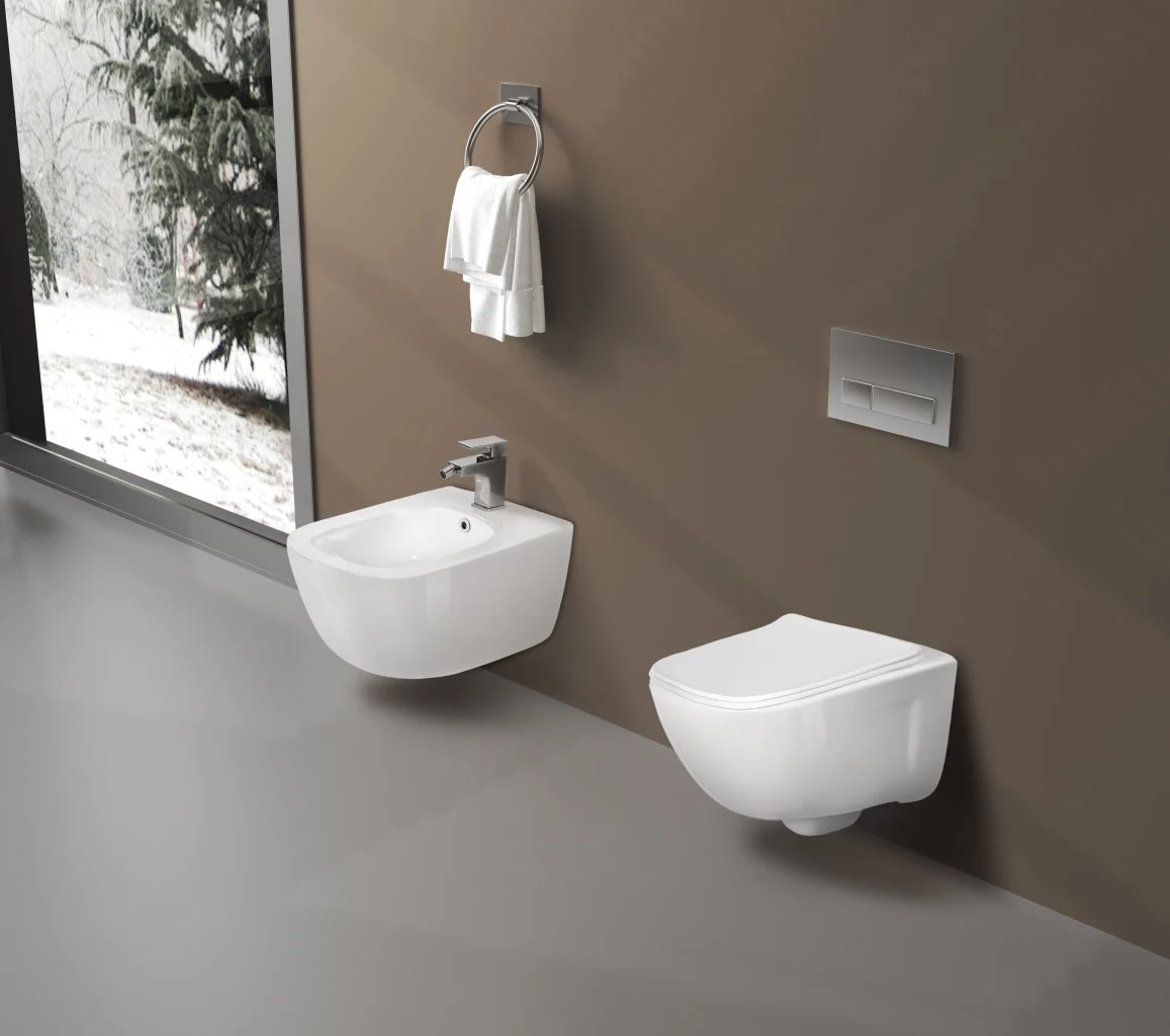 унитаз подвесной, бидетка встроенная в унитаз + смеситель на горячую и холодную воду, ультратонкое сидение из дюропласта с микролифтом , комплект креплений для скрытого монтажа унитаза
