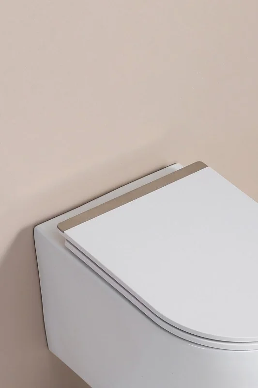 БЕЗОБОДКОВЫЙ подвесной унитаз. Горизонтальный выпуск ("P-Trap" 180 мм). Цвет: белый. Сиденье: ультратонкое. быстросъёмное. дюропласт с металлическим крепежом и микролифтом (механизм "Soft Close"), декорировано пластиной из нержавеющей стали.