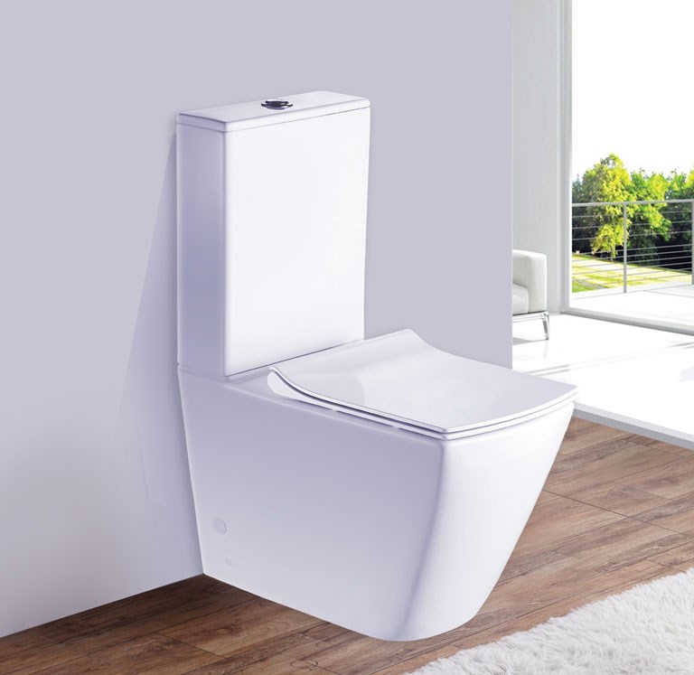 БЕЗОБОДКОВЫЙ напольный унитаз. Бортик по периметру чаши. Горизонтальный выпуск ("P-Trap"). Нижний подвод воды. Цвет: белый. Арматура: "GEBERIT" с двойной кнопкой слива (4/6 л). Сиденье: тонкое, быстросъёмное, дюропласт с металлическим крепежом и микролифтом (механизм "Soft Close").