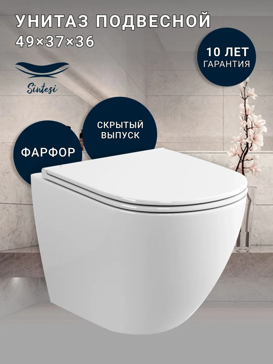 Унитаз подвесной безободковый вихревой со скрытым сливом Sintesi Hurricane, сиденье дюропласт микролифт.
