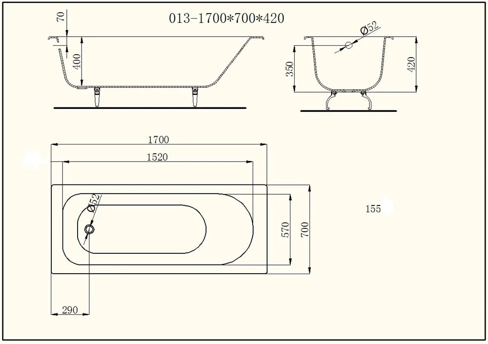 Ванна чугунная BYON 13 - 170*70*42. Классическая ванна 170х70 см . Белая Ванна чугунная с идеально ровным покрытием высокопрочной эмали.