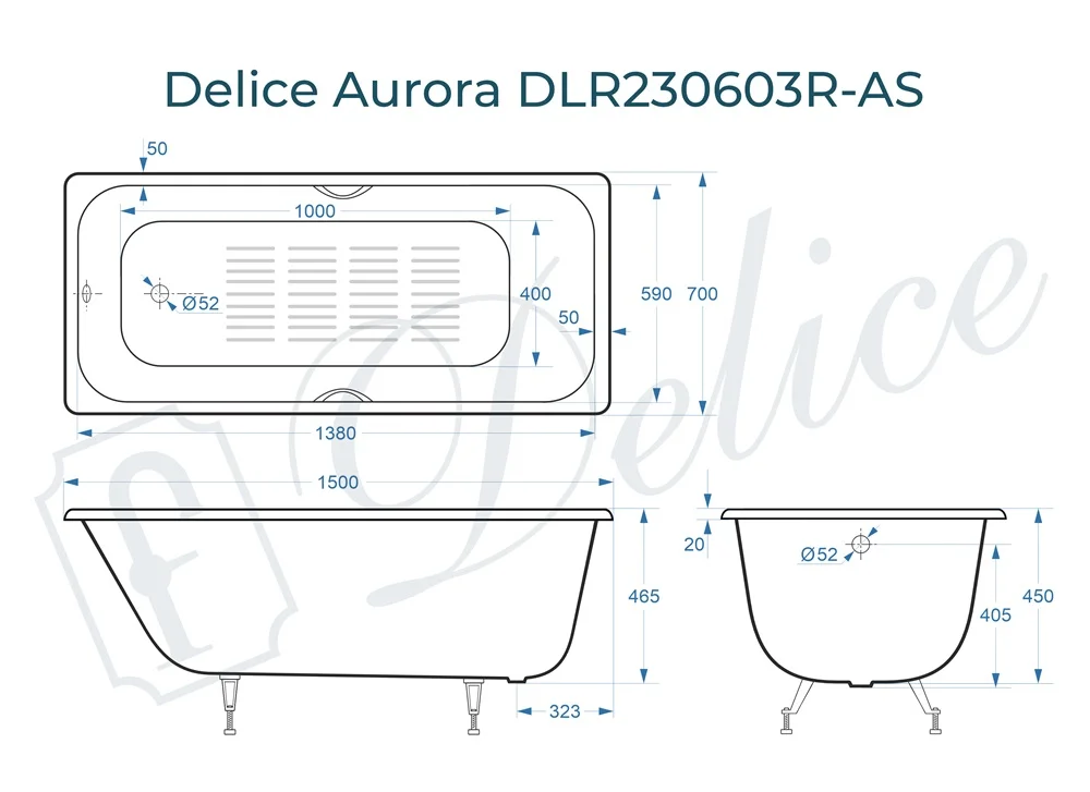 Ванна чугунная Delice Aurora 1500х700 с отверстиями под ручки и антискользящим покрытием DLR2 DLR230603R-AS