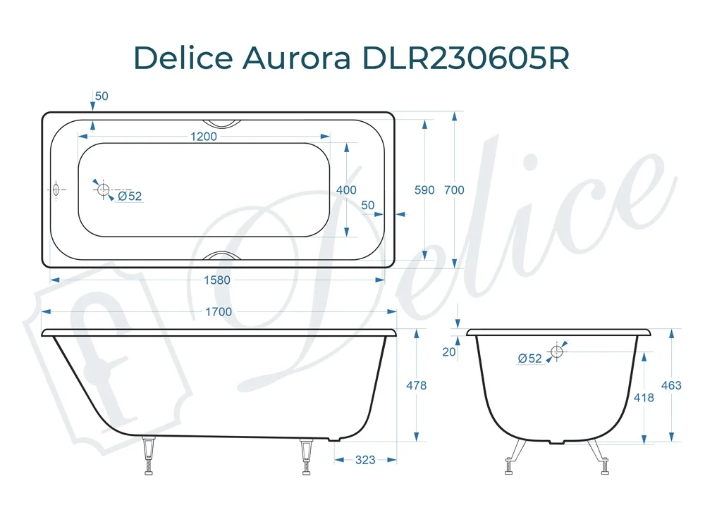 Ванна чугунная Delice Aurora 1700х700 с отверстиями под ручки DLR230605R