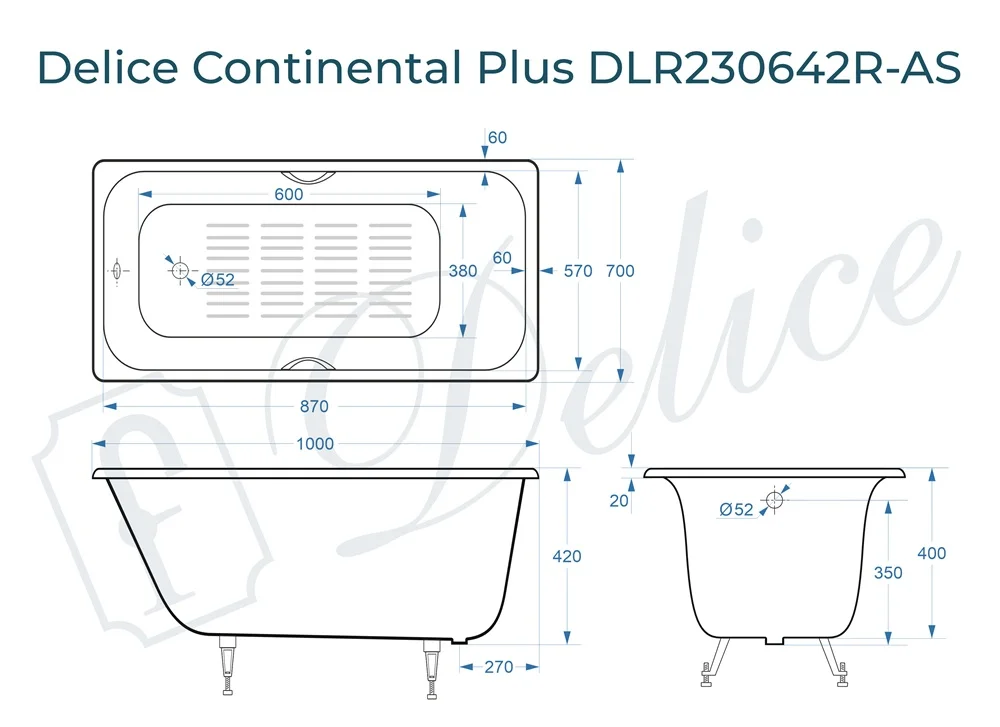 Ванна чугунная Delice Continental PLUS 100х70 с отверстиями под ручки и антискользящим покрытием DLR230642R-AS