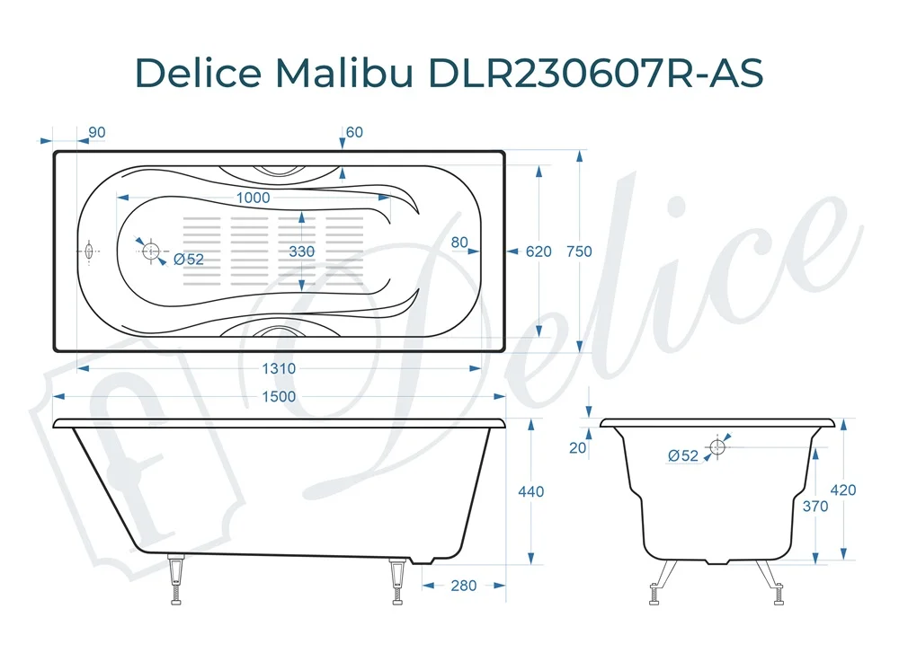 Ванна чугунная Delice Malibu 1500х750 с отверстиями под ручки и антискользящим покрытием DLR2 DLR230607R-AS