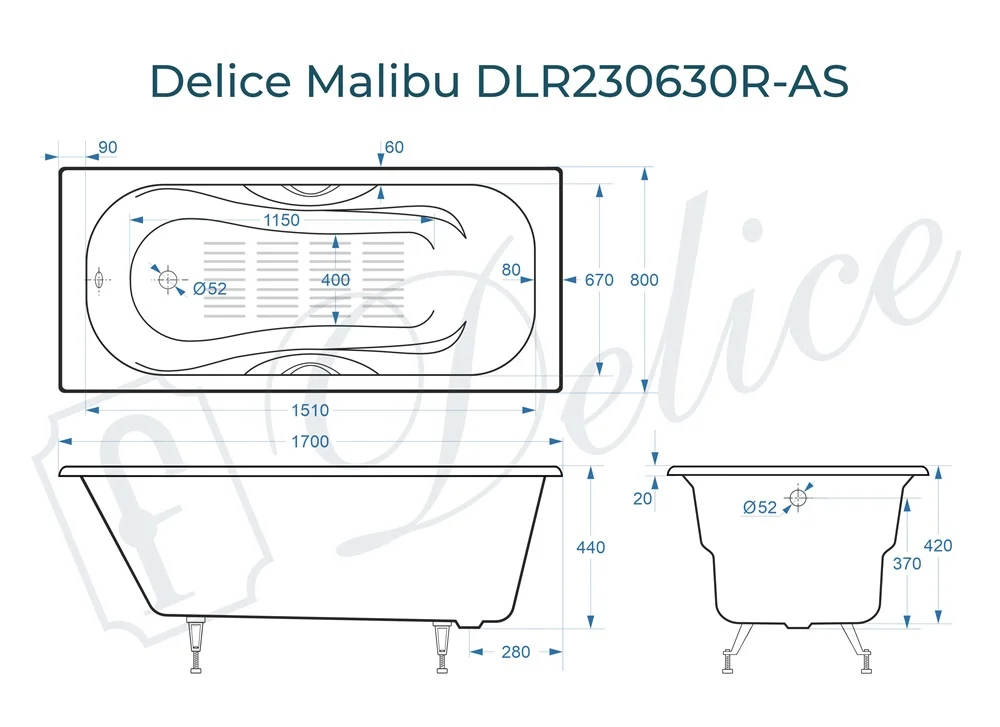Ванна чугунная Delice Malibu 170х80 с отверстиями под ручки и антискользящим покрытием DLR230630R-AS