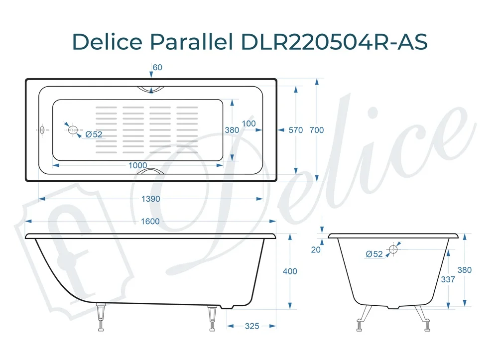 Ванна чугунная Delice Parallel 1600х700 с ручками и антискользящим покрытием DLR220504R-AS