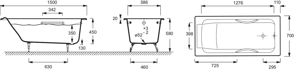 Parallel 150х70см, ванна, чугунная, прямоугольная, с антискользящим покрытием, с отверстиями под ручки, без г/м, арт. E2949-00, Jacob Delafon