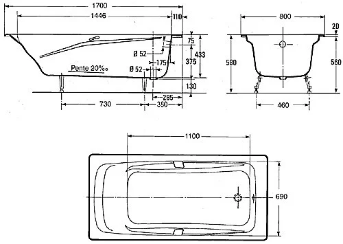 Repos 170х80см, ванна, чугунная, прямоугольная, с антискользящим покрытием, с отверстиями для ручек, арт. E2915-00, Jacob Delafon
