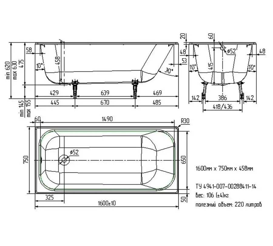 • Комплект регулируемых ножек не входит в стоимость ванны и продается отдельно