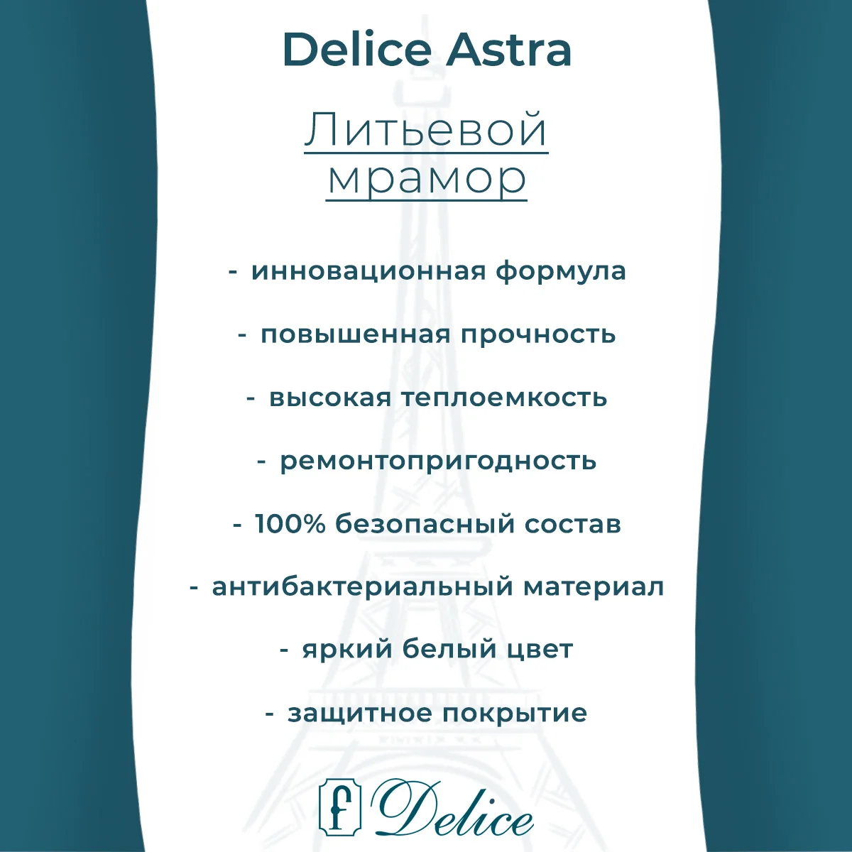 Литьевой мрамор Delice создан по инновационной передовой технологии. Для улучшения характеристик в состав добавляют модифицирующие компоненты, которые придают материалу уникальные свойства: