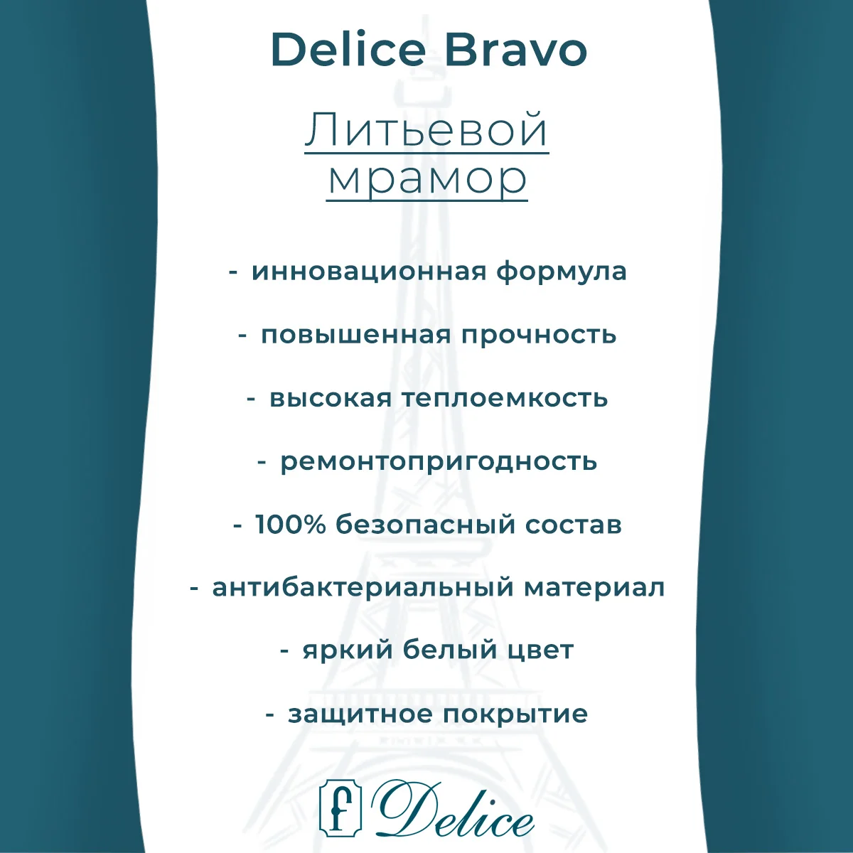 Литьевой мрамор Delice создан по инновационной передовой технологии. Для улучшения характеристик в состав добавляют модифицирующие компоненты, которые придают материалу уникальные свойства: