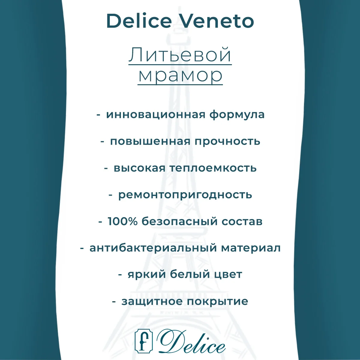 Литьевой мрамор Delice создан по инновационной передовой технологии. Для улучшения характеристик в состав добавляют модифицирующие компоненты, которые придают материалу уникальные свойства: