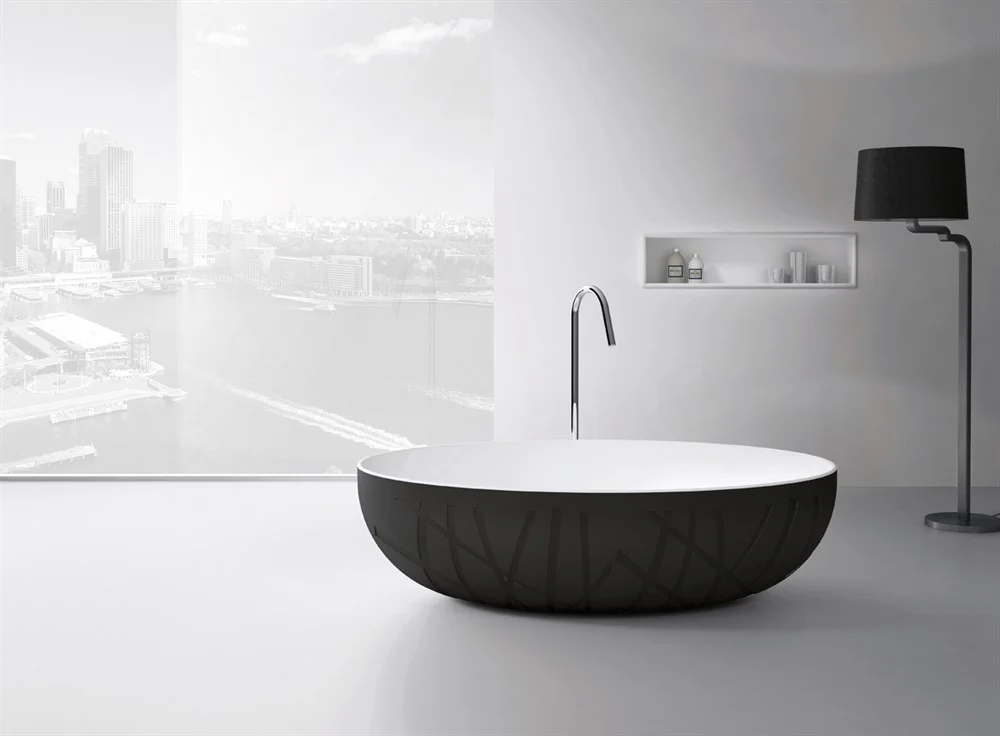 Лаконичная по форме и выразительная по дизайну ванна может украсить центр помещения или использоваться традиционным методом – у стены. Она имеет оригинальную овальную форму с вертикальными стенками и окрашена в два различных цвета. Внутри ванна классического белого цвета, превращающего купание в настоящее эстетическое наслаждение, а снаружи матовая.