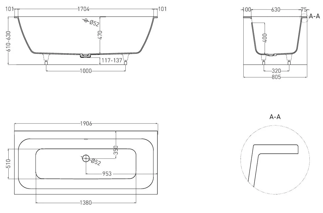 Она предназначена как для полного или частичного встраивания, так и для любой установки — пристенной, угловой или отдельно стоящей. Ванна характеризуется одинаковым уклоном бортов. Название модели Axis («Ось») отражает характерную симметрию ванны во фронтальной проекции.