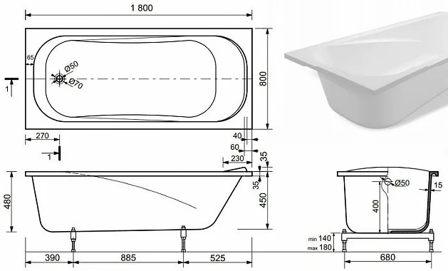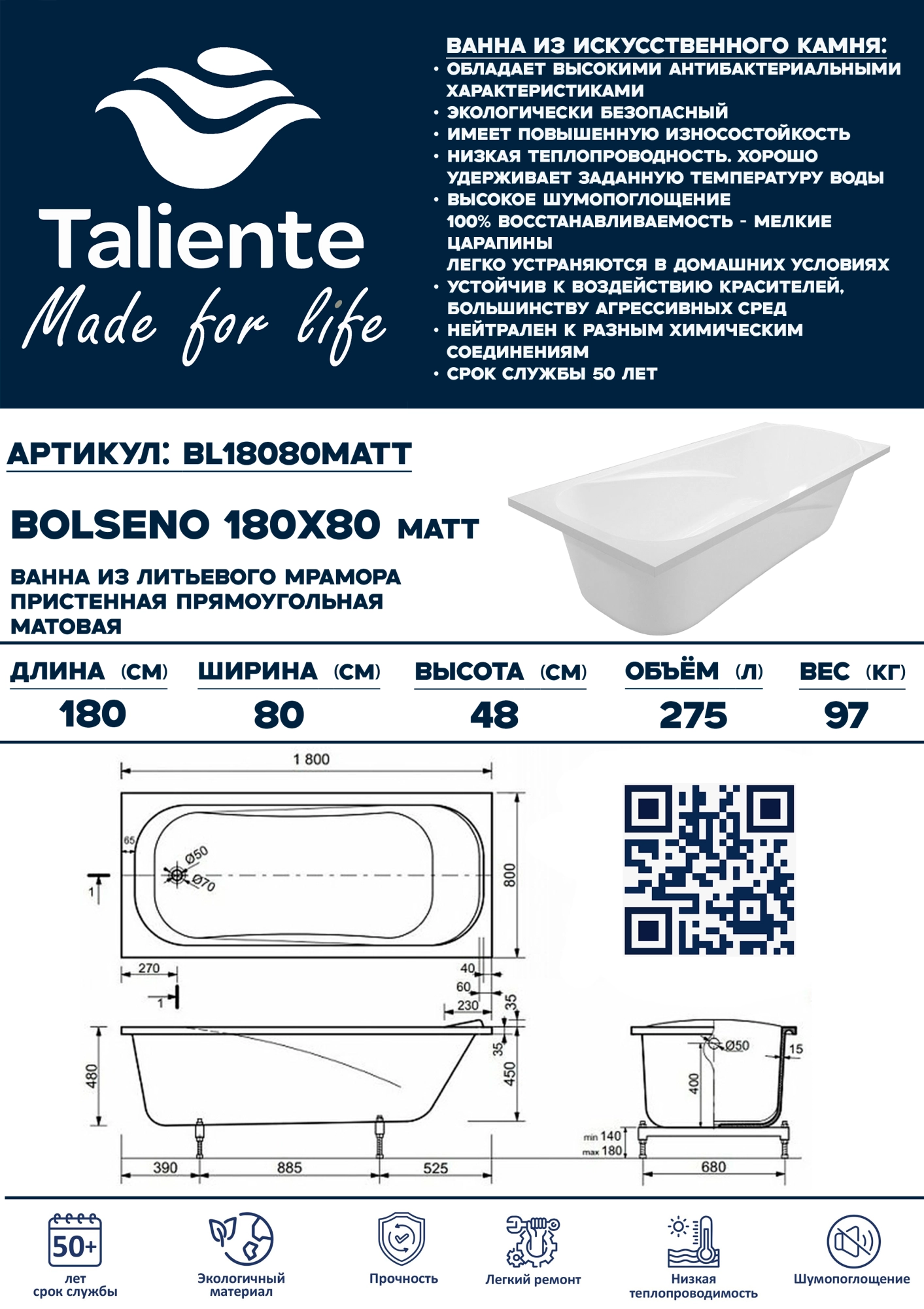 Ванна из искусственного камня Taliente Bolseno Matt 1800х800 BL18080Matt