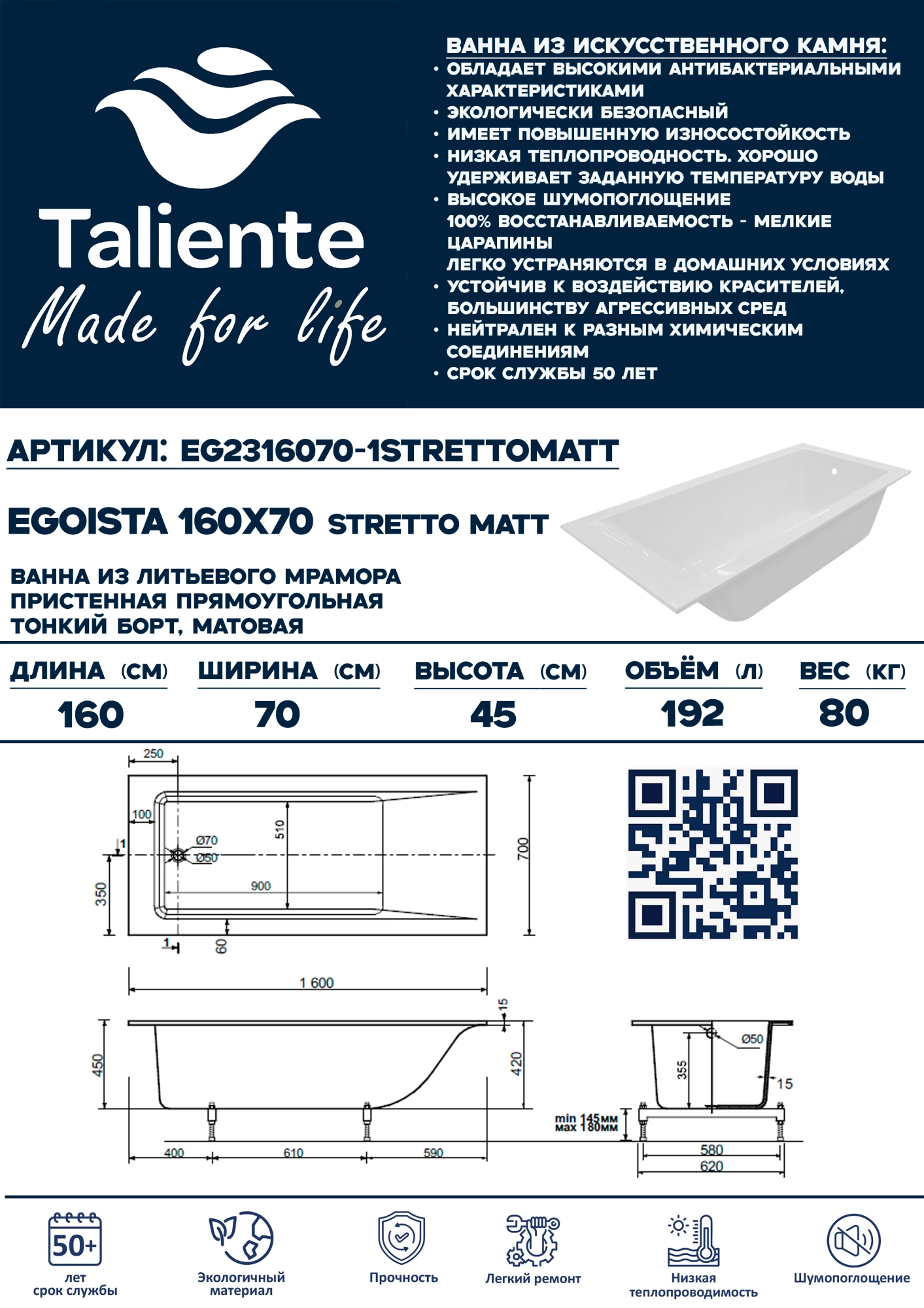 Ванна из искусственного камня Taliente Egoista Stretto Matt 1600х700 EG2316070-1StrettoMatt