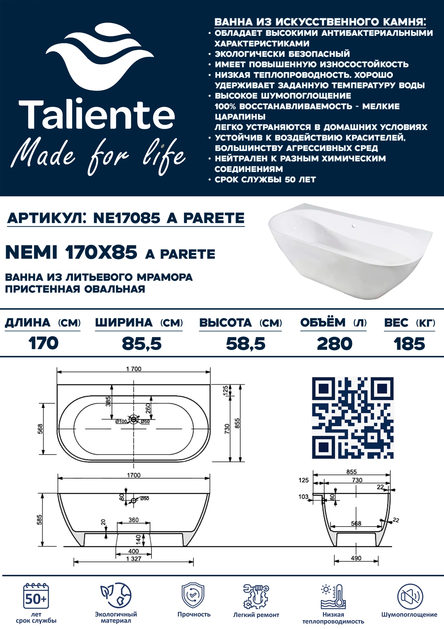 Ванна из искусственного камня Taliente Nemi a parete 1700х855 NE17085 a parete