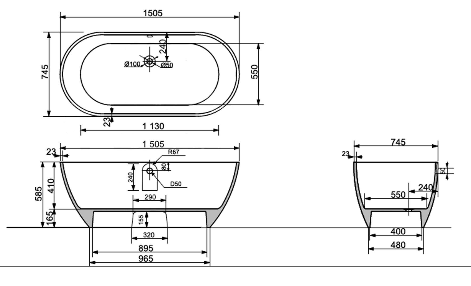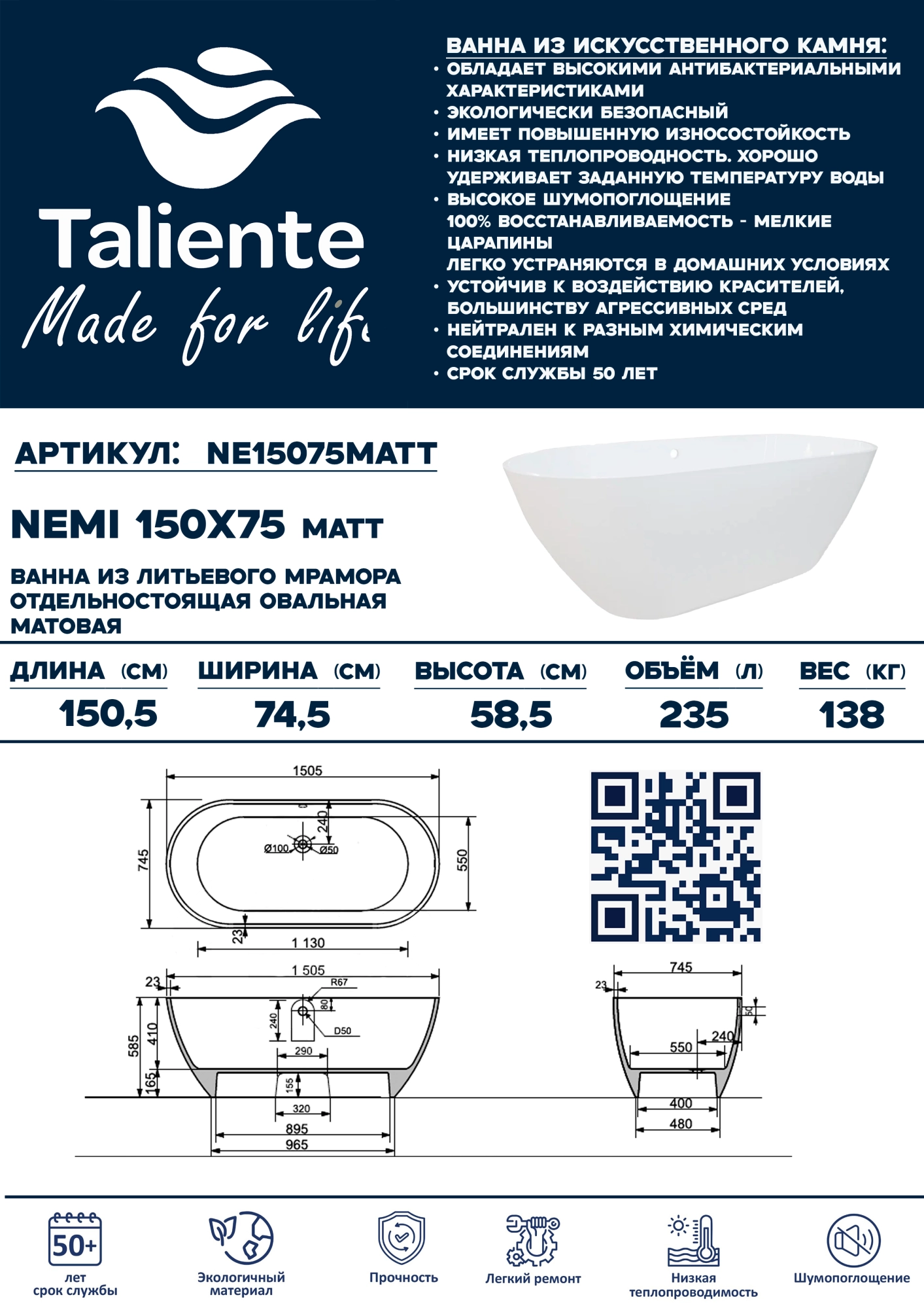 Ванна из искусственного камня Taliente Nemi Matt 1500х750 NE15075Matt