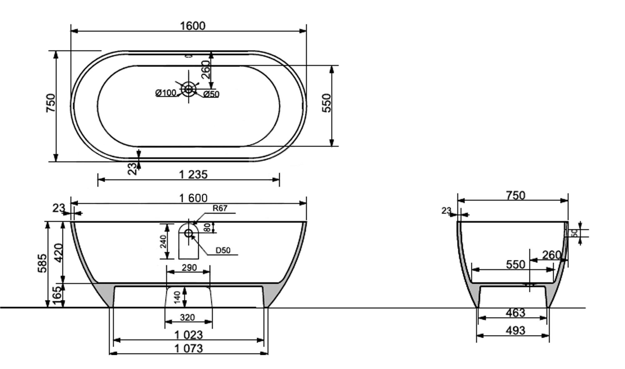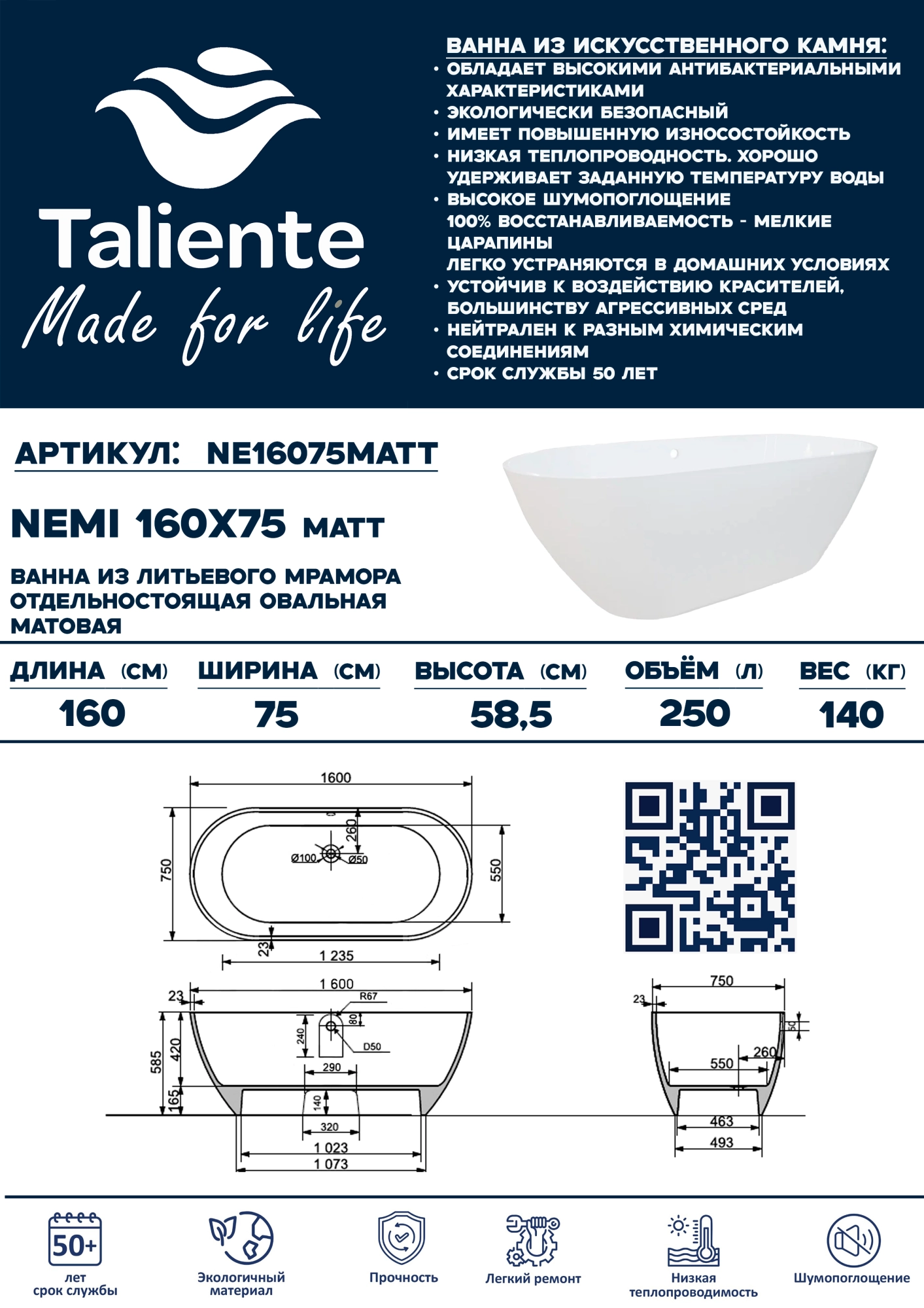 Ванна из искусственного камня Taliente Nemi Matt 1600х750 NE16075Matt