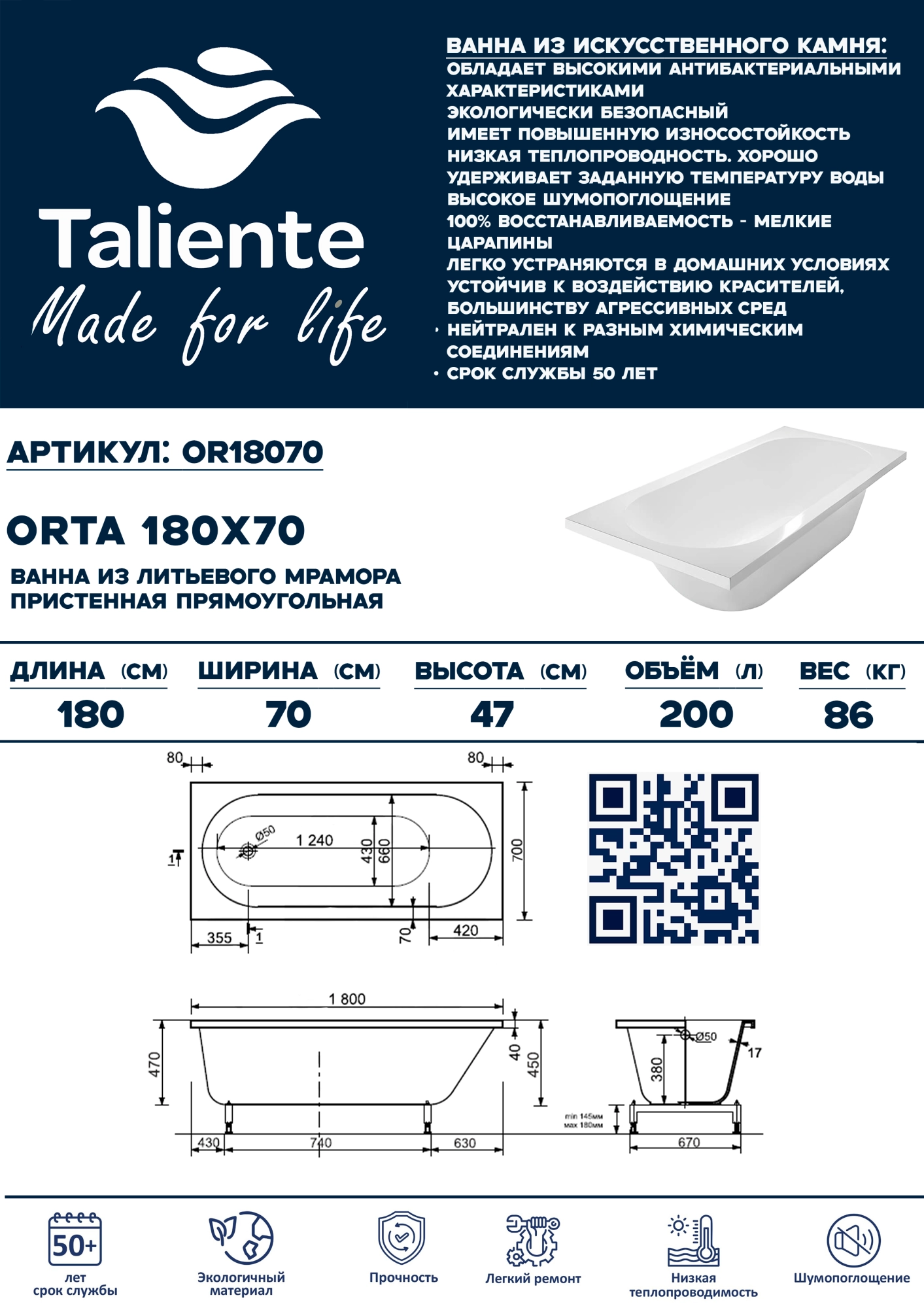 Ванна из искусственного камня Taliente Orta 1800х700 OR18070