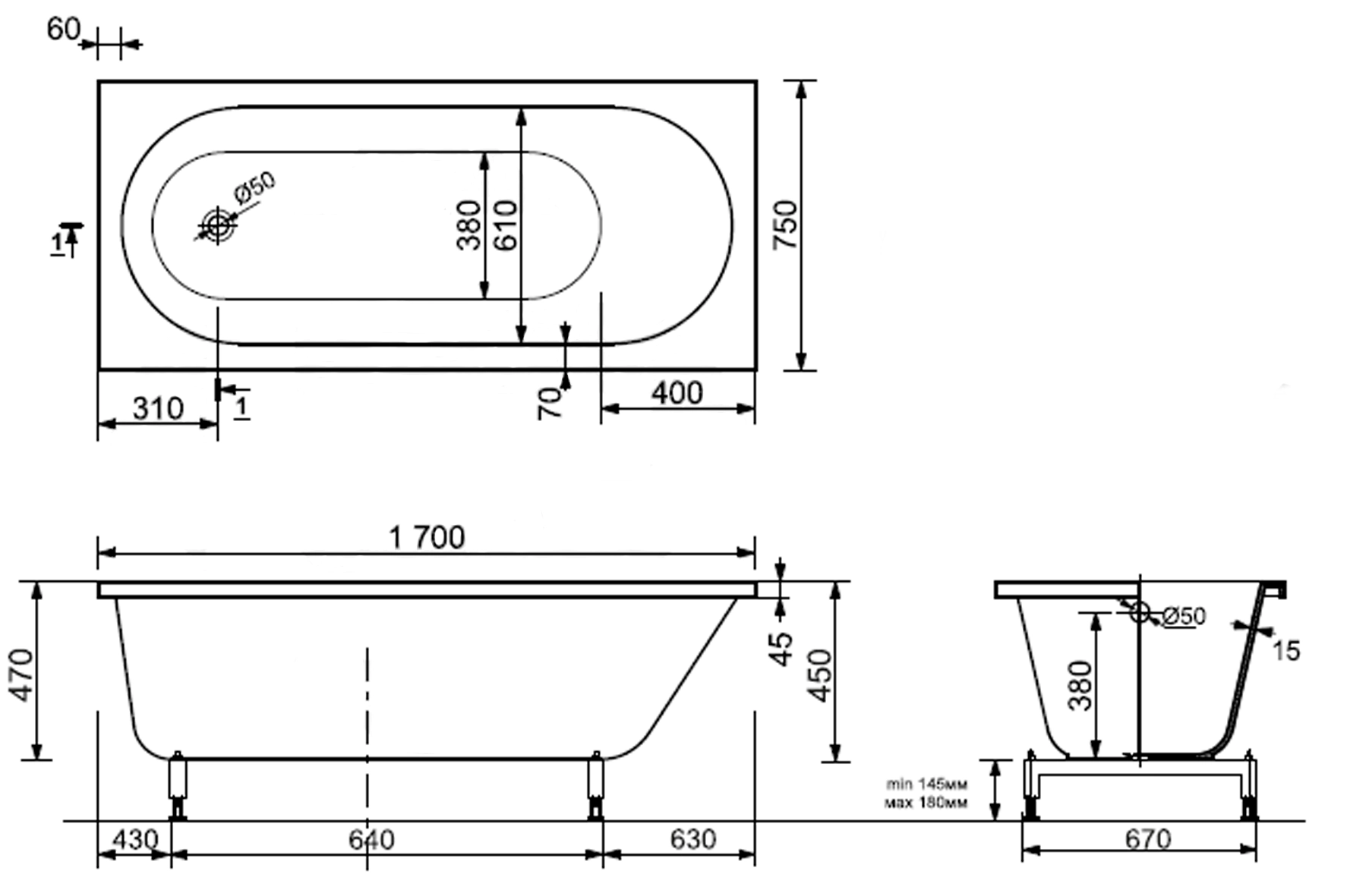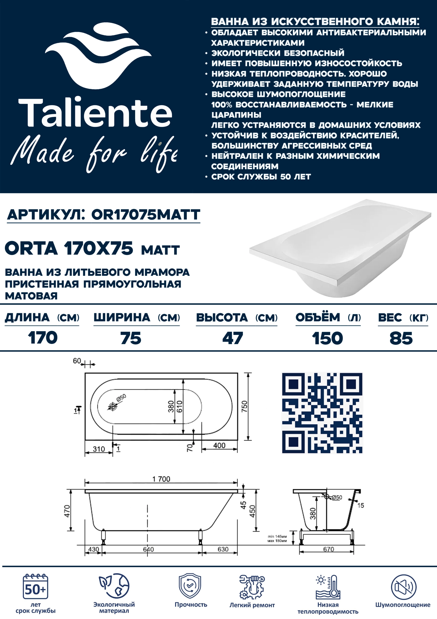 Ванна из искусственного камня Taliente Orta Matt 1700х750 OR17075Matt