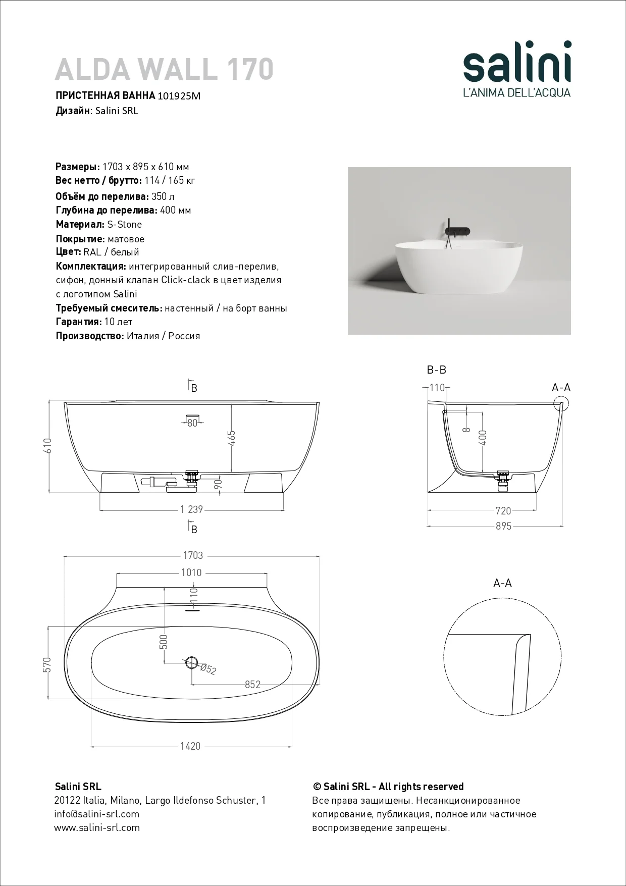 Ванна из искусственного камня Salini ALDA WALL 170 покраска по RAL полностью 101925MF S-Stone