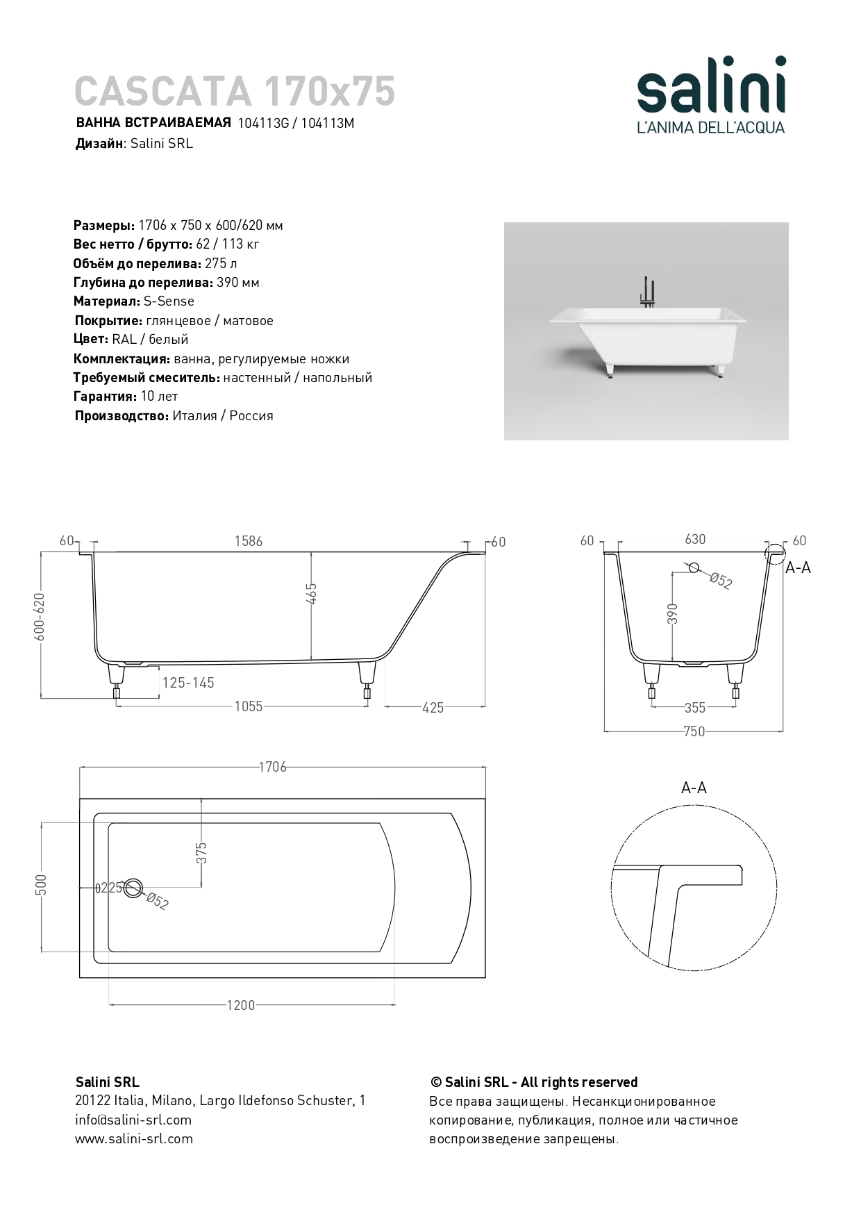 Ванна из искусственного камня Salini CASCATA 170x75 покраска по RAL полностью 104113MF S-Sense