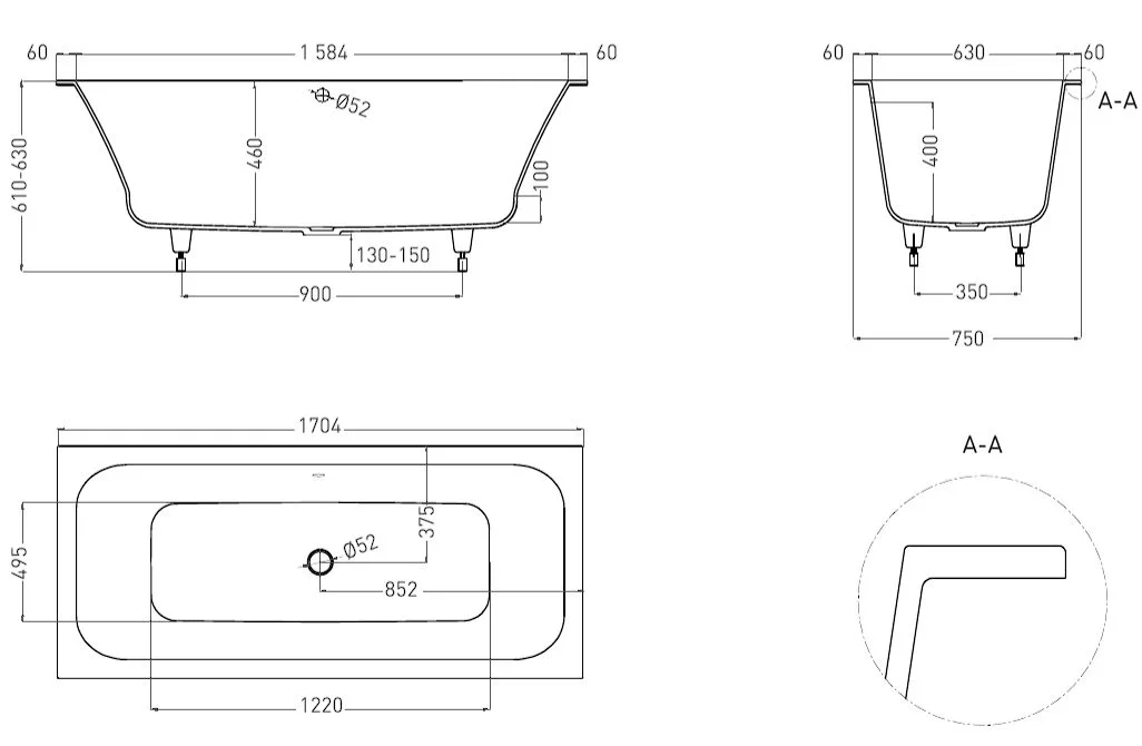 Она предназначена как для полного или частичного встраивания, так и для пристенной или угловой установки. Ванна характеризуется одинаковым уклоном бортов и расположенными посередине сливом-переливом и донным клапаном. Название модели Axis («Ось) отражает характерную симметрию ванны во фронтальной проекции.