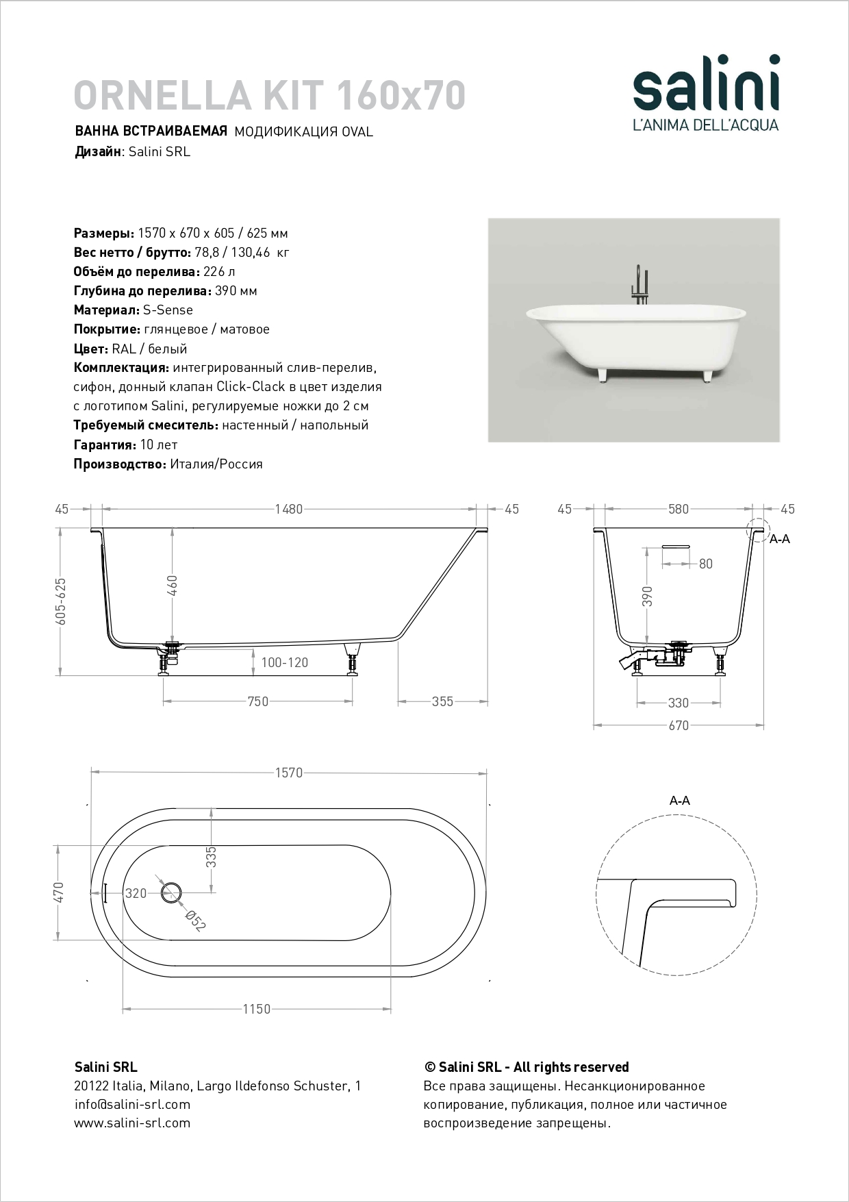 ORNELLA – это серия встраиваемых ванн Salini с овальной чашей.
