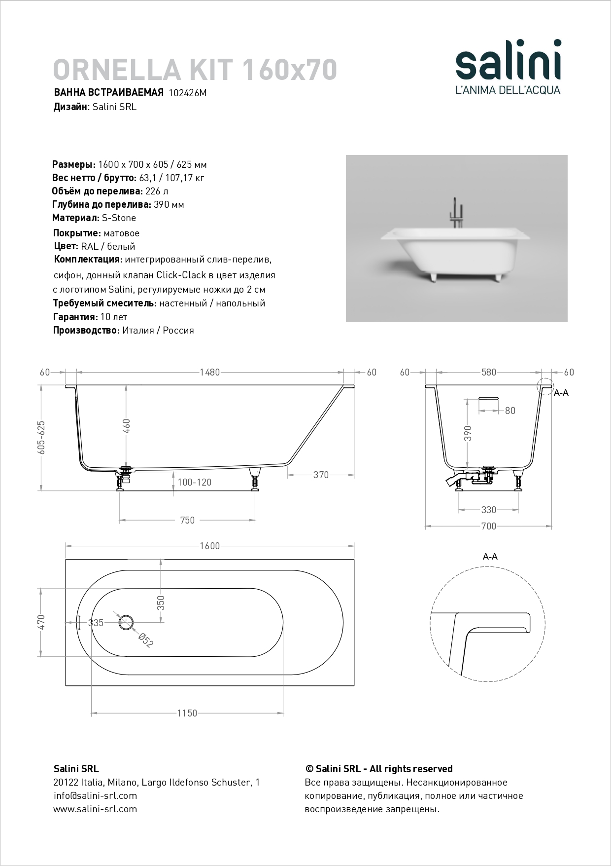 ORNELLA КIТ - это встраиваемая ванна с овальной округлой чашей, которая идеально вписывается в пространство от стены до стены в ванных комнатах небольших размеров.