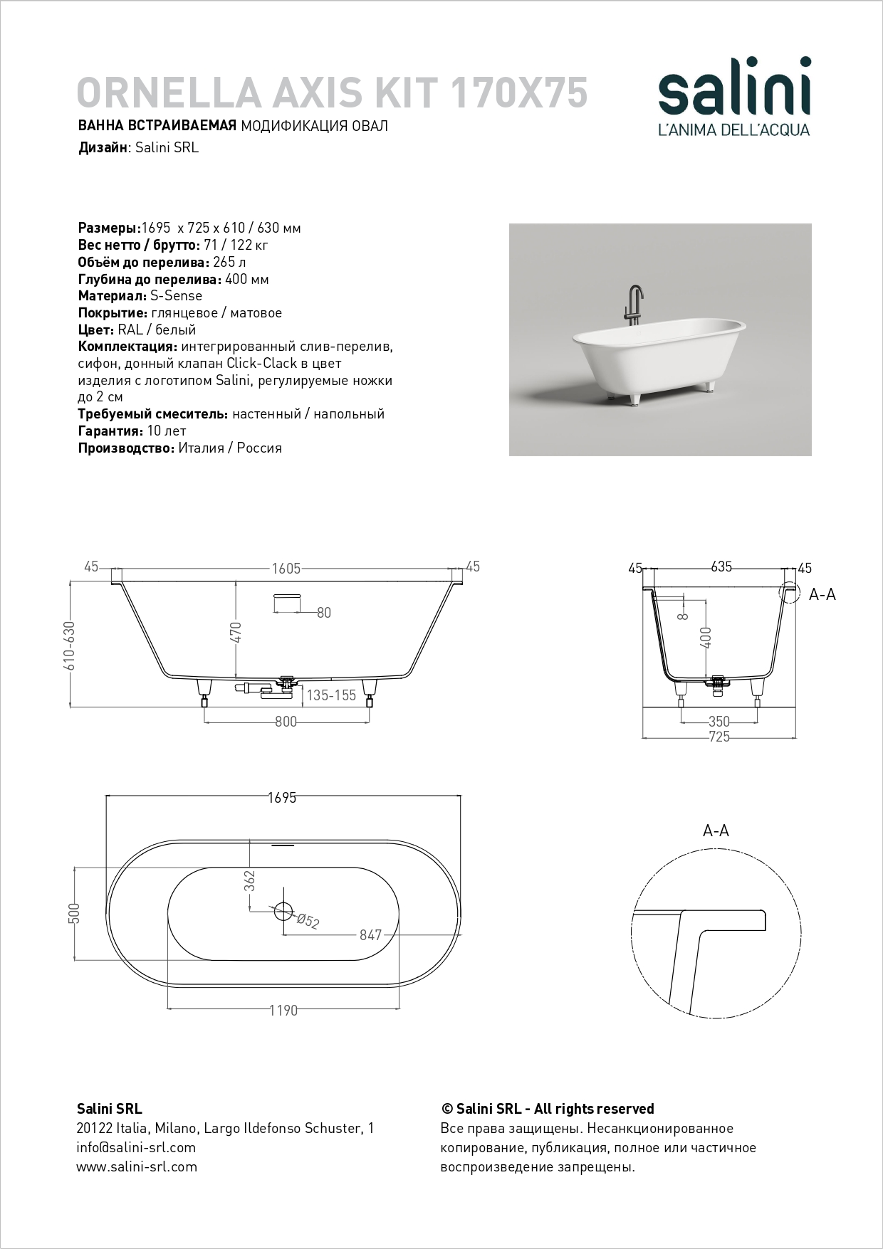 ORNELLA AXIS KIT 170 – самая универсальная ванна Salini из литого камня.