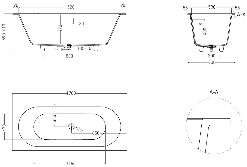 Она предназначена как для полного или частичного встраивания, так и для пристенной или угловой установки. Ванна характеризуется одинаковым уклоном бортов и расположенными посередине сливом-переливом и донным клапаном. Название модели Axis («Ось) отражает характерную симметрию ванны во фронтальной проекции.