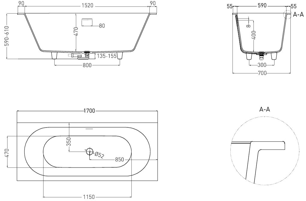 Красавица Ornella характеризуется одинаковым пологим уклоном бортов и расположенными посередине сливом-переливом и донным клапаном. Название модели Axis («Ось) отражает характерную симметрию ванны во фронтальной проекции.