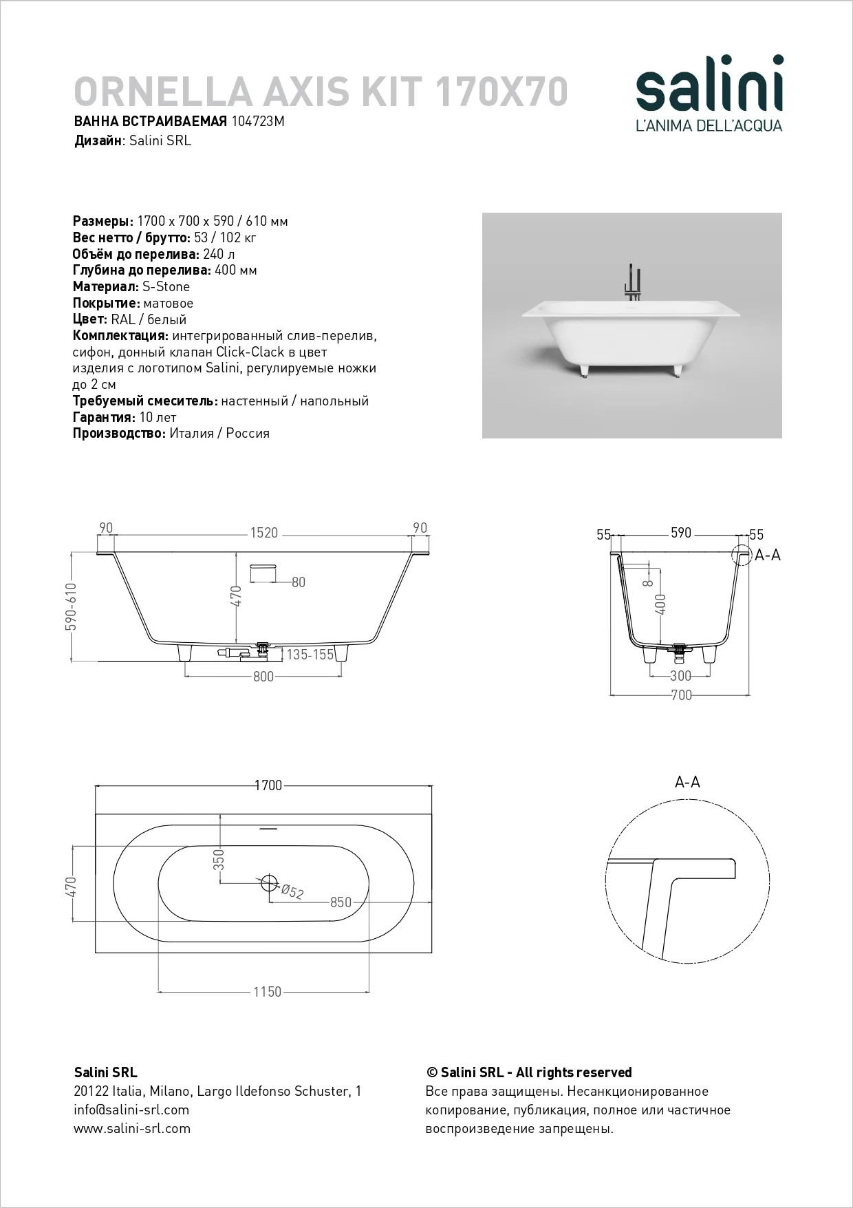 Ornella Axis — универсальная ванна Salini из литого камня, отличающаяся просторной чашей идеально округлой формы. Вневременная эстетика и чистые линии корпуса ванны делает её уместной и желанной как в классическом, так и в современном интерьере. Ванна предназначена для полного или частичного встраивания, а также для любой установки - пристенной, угловой или отдельностоящей.