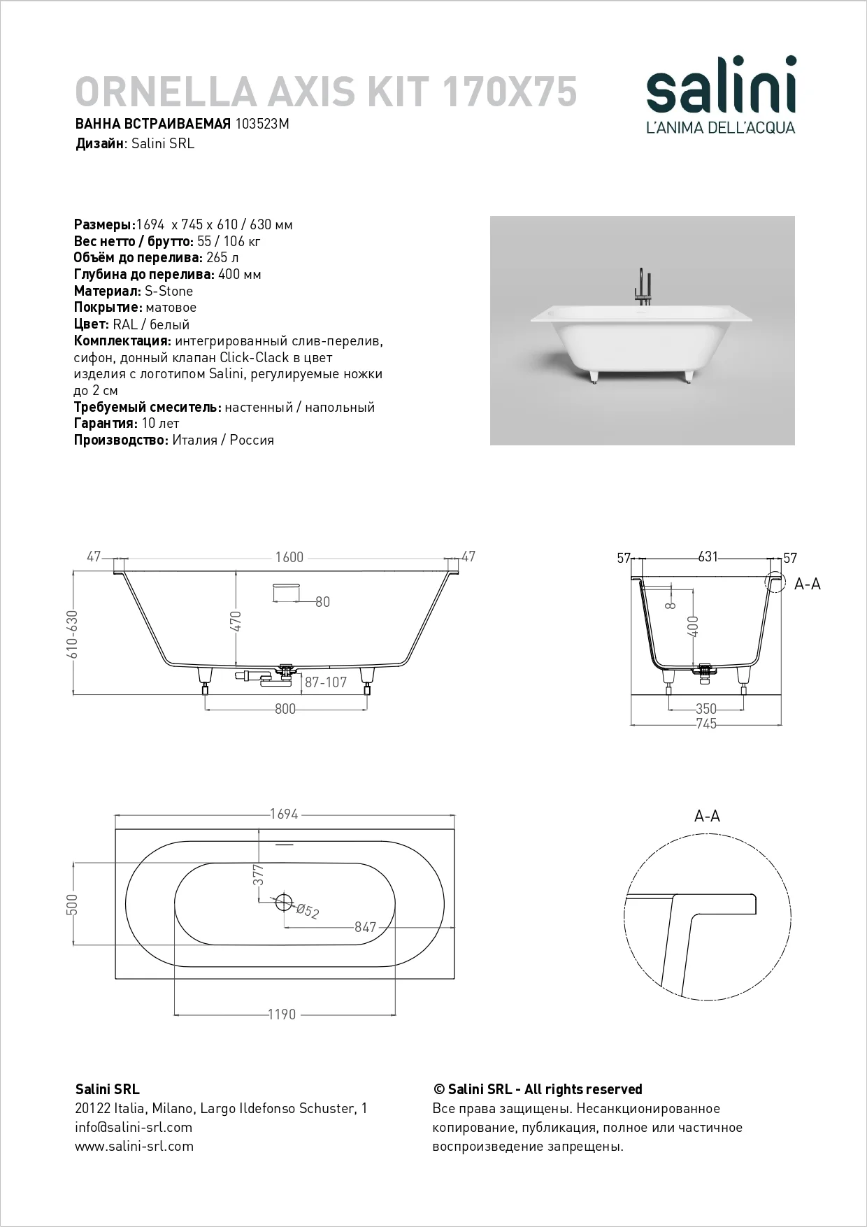 Красавица Ornella характеризуется одинаковым пологим уклоном бортов и расположенными посередине сливом-переливом и донным клапаном. Название модели Axis («Ось) отражает характерную симметрию ванны во фронтальной проекции.
