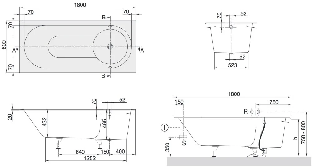- Комплект ножек для ванны (самоклеящихся) входит в поставку, регулируются от 130 — 180 мм