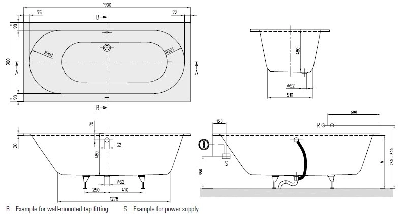 1 прямоугольная ванна, 2 подставки для ванны (самоклеящияся), регулируемые от 130 до 180 мм