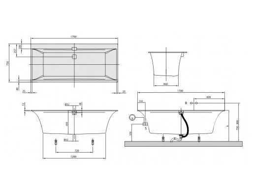 1 прямоугольная ванна, 2 подставки для ванны (самоклеящияся), регулируемые от 130 до 180 мм, 1 удлиненный слив и перелив (хромированный и белый)